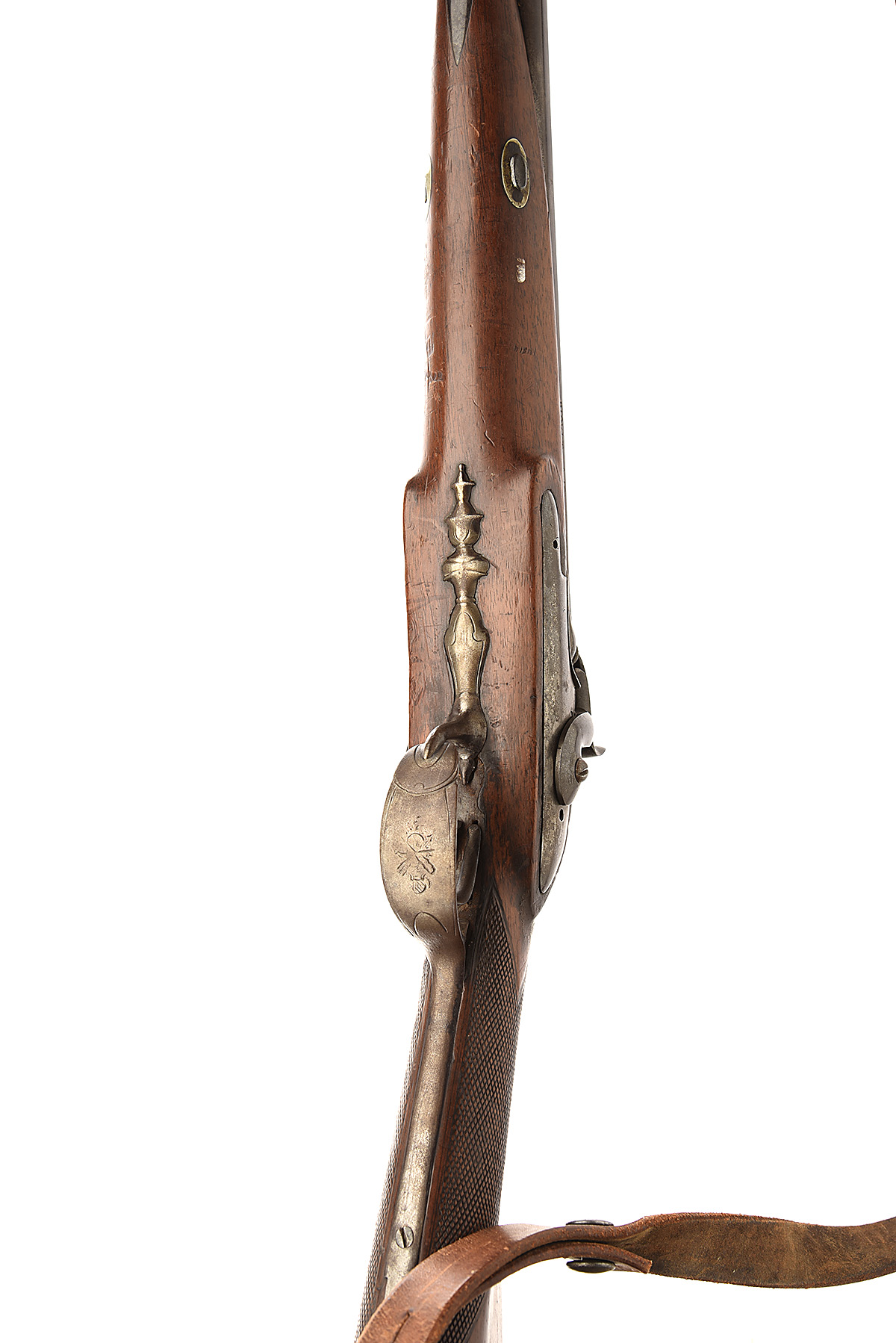 A 20 BORE CONTINENTAL DOUBLE BARREL PERCUSSION SPORTING GUN SIGNED PIQVLT" CIRCA 1840, no visible serial number, with 33 1/2ins. barrels the left barrel flat stamped "PIQVLT A.I.C", the locks in typical continental style are of rounded form probably converted from flintlock are plain and unmarked and fitted with dolphin headed hammers, the right lock with defective sear, iron mounted walnut half-stocked, with chequered wrist and plain forend, the mounts include butt-plate with long tang, the trigger guard with engraved decoration to bow and long decorative finial, the barrels damaged at the muzzle and to a brown / grey patina, the stock quite sharp with some losses to the right forend including a tapering piece approx. 3" long above the lock, rod a poor replacement.