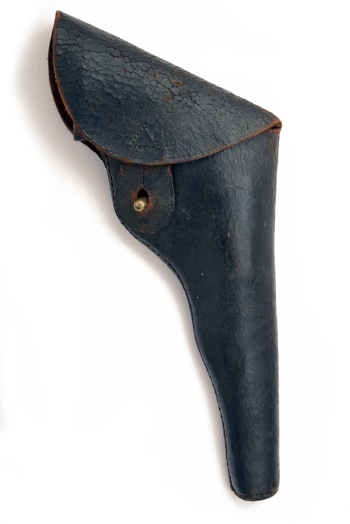 A UNITED STATES .31 PERCUSSION COLT MODEL 1849 LONDON 'POCKET', serial number 1942, 1850, with 5 in octagonal barrel, top flat marked 'ADDRESS COL. COLT / LONDON'. 5-shot cylinder, open steel frame with London proofs, under-barrel rammer, wooden grips, together with a black leather holster, visible serials are matching, heavily worn, scrubbed of all finish, traces of frame script only, no visible cylinder scene, front sight filed down, action at fault, replaced grips, 12 in. overall with holster