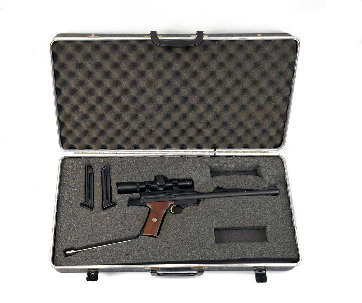 A CASED .22 (L/R) LONG-BARRELLED SEMI-AUTOMATIC PISTOL BY BROWNING, MODEL BUCKMARK, serial no. 213MR02221, with blacked12 1/4in. barrel, blacked slide, alloy frame with smooth walnut grips, permanent extension bar to rear for UK regulations, fitted with an AGS 2x20 pistol telescopic sight. in a foam-lined case with spare magazine