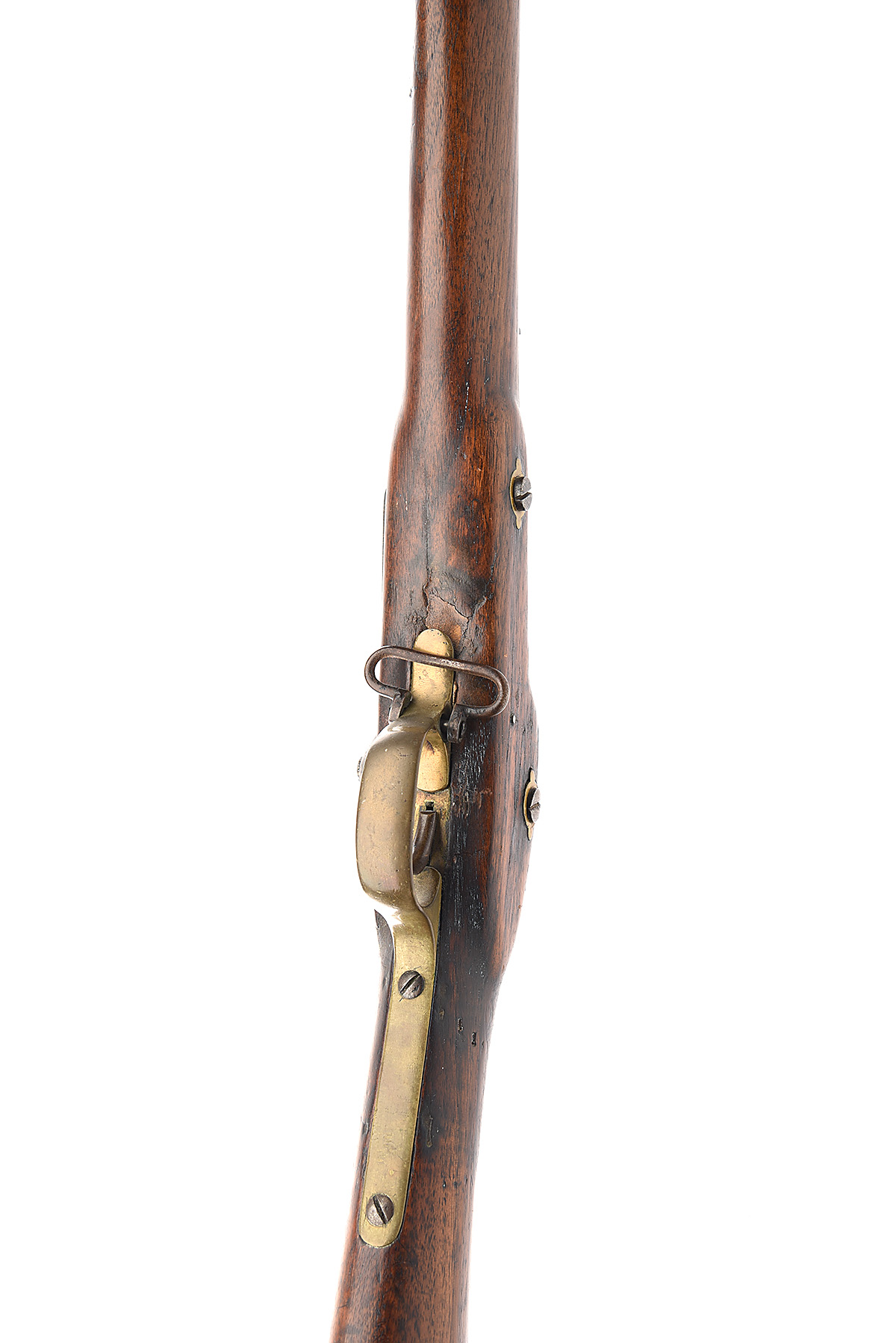 with 35 1/2ins. barrel with crude form of bolster, and stamped with various ordnance style proof and inspection marks at breech including "STEEL", block and blade front sight, fixed block vee rear-sight, the lock of Enfield P53 type stamped with a crown on the tail and "TOWER / 1870" to the centre, regulation brass mounted full walnut stock, three barrel bands of streamlined Baddeley pattern, complete with its jag headed steel rod, barrel to a grey patina worn overall. Made from surplus military parts for the Indian market.