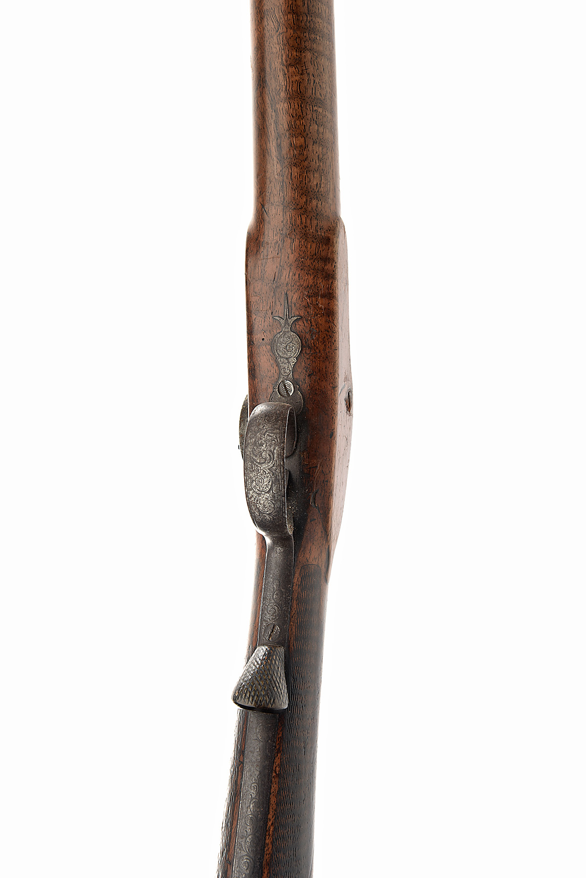 A 12 BORE SINGLE BARREL PERCUSSION SPORTING GUN BY COCKSEDGE OF HADLEIGH, CIRCA 1850, no visible serial number, with 33 1/2 in twist barrel, engraved with a starburst and the retailers name inlaid with silver 'COCKSEDGE HADLEIGH', at the breech, nipple bolster with platinum plug, the breech area heavily corroded, foliate engraved bar-action lock the front area below the bolster heavily pitted, nipple corroded and broken, iron mounted walnut half-stocked with chequered wrist, the maker was Henry Cocksedge of Hadleigh Suffolk, established 1838-1869.