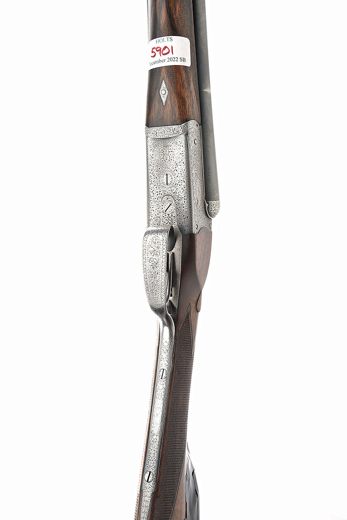 C. SMITH & SONS (NEWARK) 12-BORE BOXLOCK EJECTOR, serial no. 17324, circa 1915, 28in. sleeved nitro barrels, 2 1/2in. chambers, bored approx. imp. cyl. and 1/2 choke, scoop-back treble-grip action, carved stylised acanthus leaf fences, automatic safety with gold-inlaid 'SAFE' detail, intercepting sears, floral border and acanthus scroll engraving, 14 1/4in. stock with taped applied cheekpiece, weight 6lb. 10oz.
