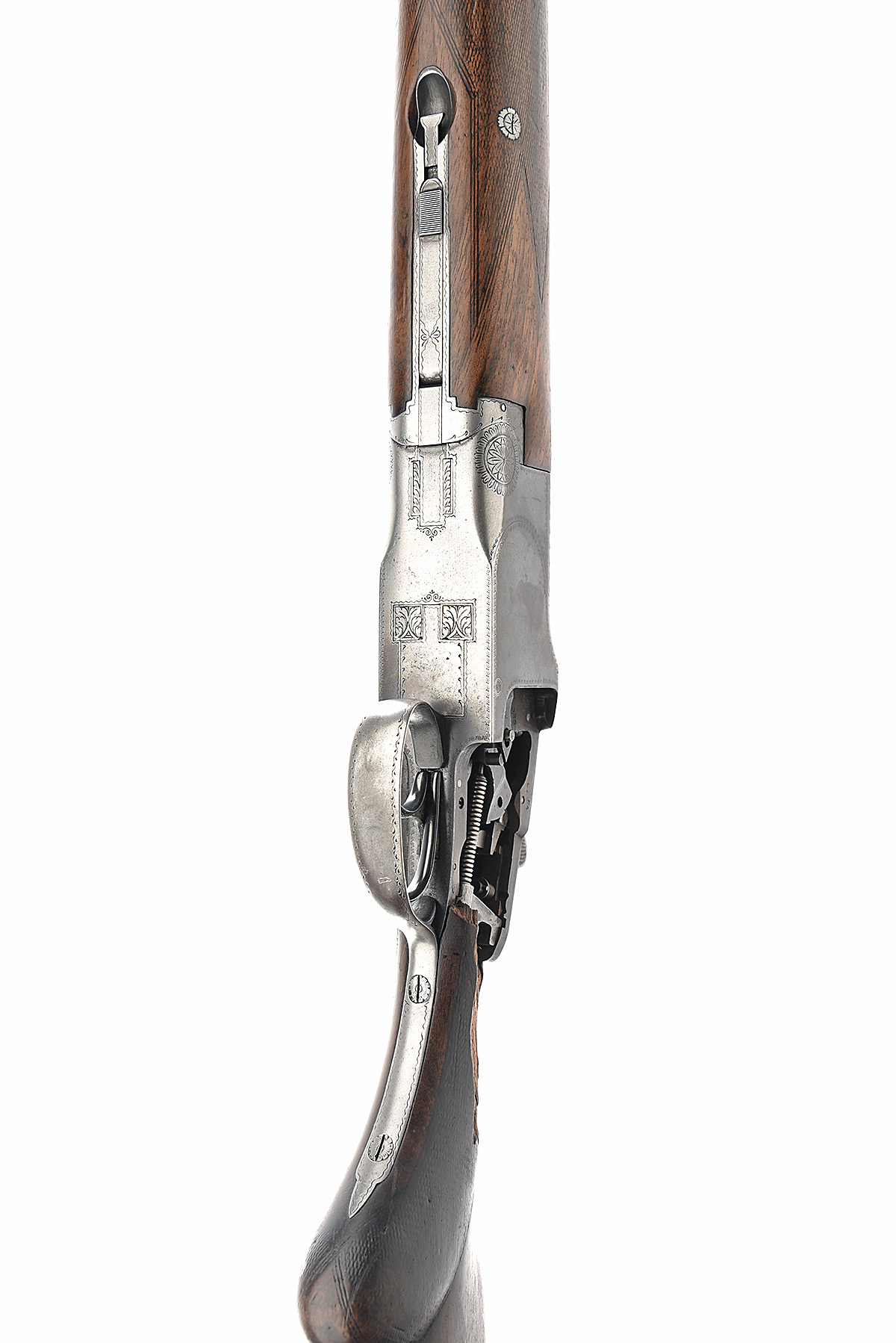 FABRIQUE NATIONALE 12-BORE DOUBLE-TRIGGER OVER AND UNDER EJECTOR, serial no. 62033, for 1957, 28in. nitro barrels with 6mm ventilated matt top-rib, 2 3/4in. chambers, bored approx. 1/2 and full choke, hold-open toplever, manual safety, border engraving, 14in. semi-pistolgrip stock smashed and missing at head, showing action innards