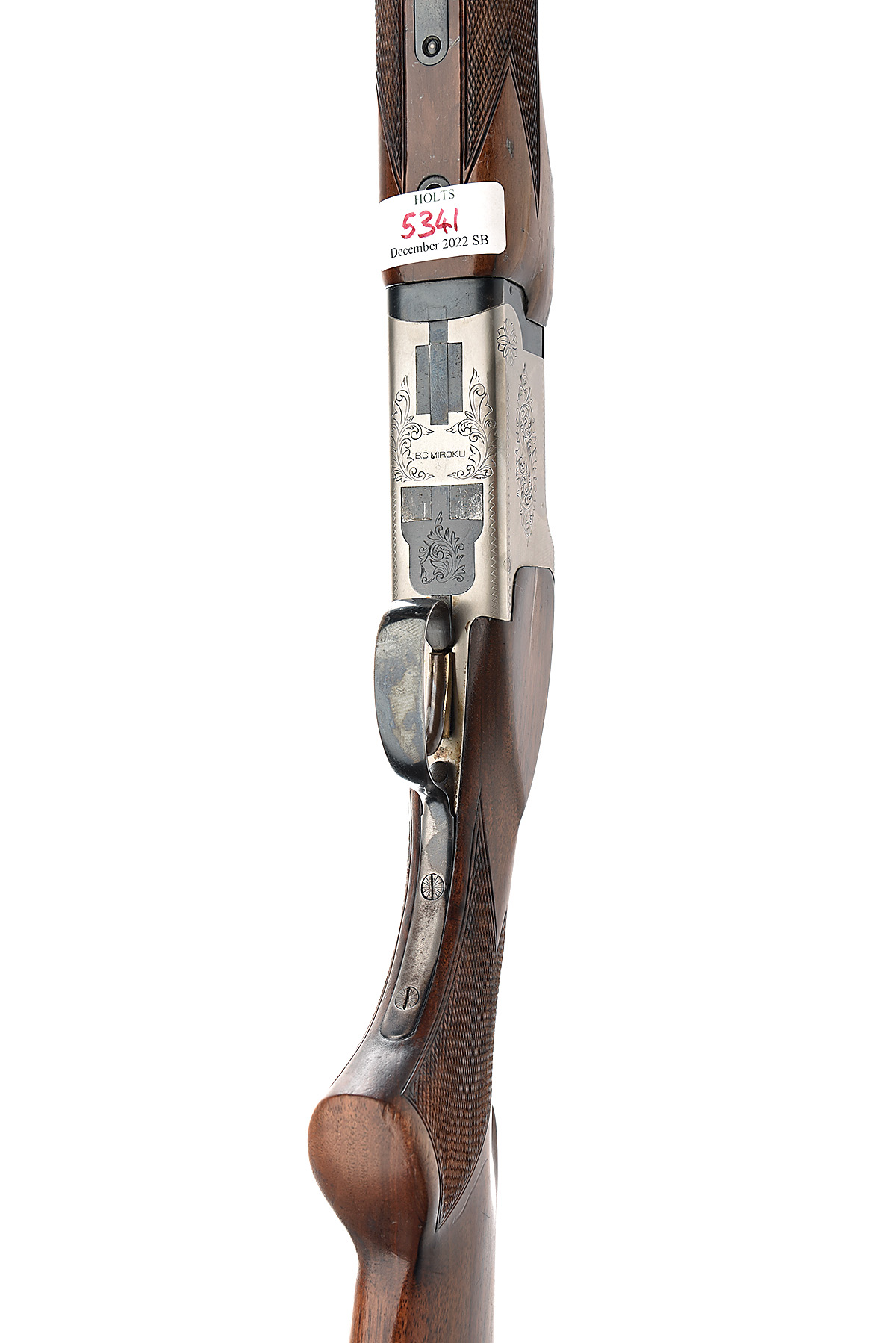 MIROKU FIREARMS MFG. CO. 12-BORE SINGLE-TRIGGER OVER AND UNDER EJECTOR, serial no. 3331411, circa 1979, 30in. nitro barrels with 10mm ventilated matt top-rib, 2 3/4in. chambers, bored approx. 1/2 and 3/4 choke, hold-open toplever, manual safety with integral barrel selector switch, gold-washed single trigger, border and partial scroll engraving, 14 1/4in. pistolgrip stock including buttplate, weight 7lb. 11oz.