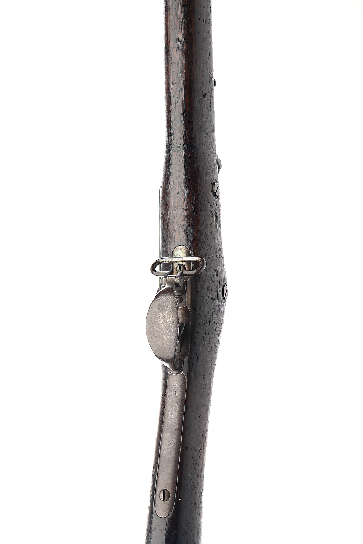 with 32 1/2in. barrel rifled with three groves, fitted with a block and blade front-sight and elevating ladder rear-sight, the hinged breech block stamped "MODEL / 1870" with the "U.S." Eagles head inspection stamp, the lock bearing the Eagle "U.S. / SPRINGFIELD" cypher to the centre and dated 1863 on the tail, regulation iron mounted full walnut stock, complete with sling swivels and original rod. The barrel, action and lock with much fading finish.