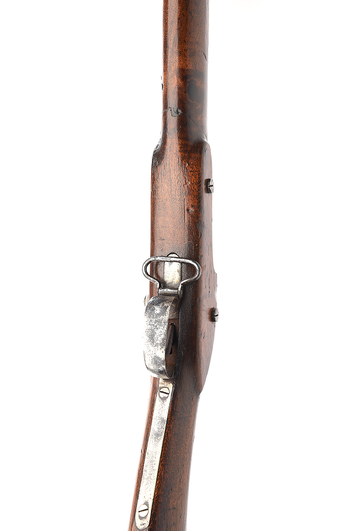 A .577 PATTERN 1859 STYLE PERCUSSION MUSKET OF INDIAN MANUFACTURE, CIRCA 1870, no visible serial number, 38ins. barrel with block and blade front-sight, fixed block vee rear-sight, the lock plain except for a faint and spurious "ENFIELD" mark to the centre, fully stocked and fitted with iron mounts including butt-plate, trigger-guard and nose-cap, two sold barrel bands and the top band of clamping pattern with sling swivel, barrel, lock and bands polished bright with some pitting and staining, complete with rod.