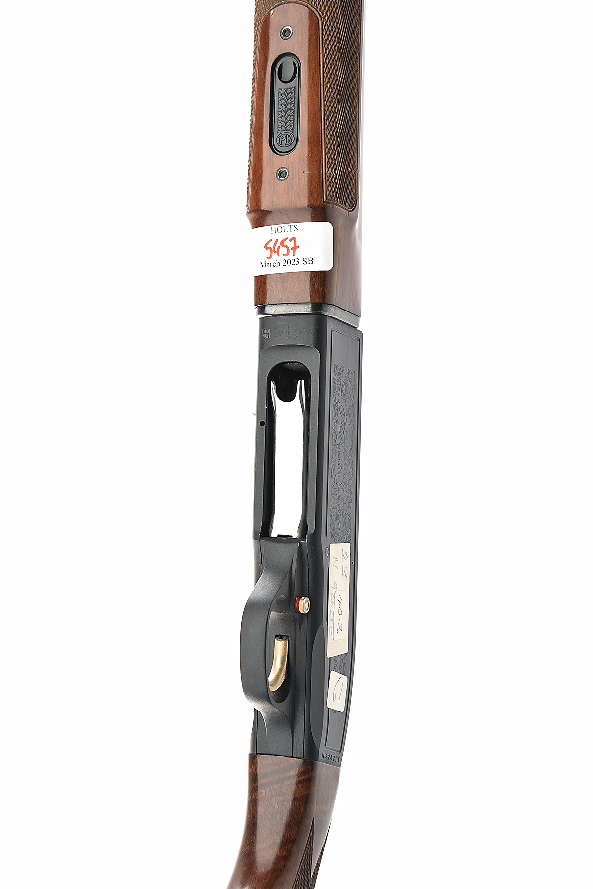 P. BERETTA 20-BORE 'MOD. A303' SEMI-AUTO SHOTGUN, serial no. N192621E, for 1992, restricted magazine, 26 1/4in. nitro barrel with 6mm ventilated matt rib, 2 3/4in. chamber, bored approx. full choke, manual safety, gold-washed trigger, magazine cut-off switch, blacked action with border and partial acanthus scroll engraving, 13in. pistolgrip stock including rubber recoil pad, semi-beavertail fore-end, weight 6lb. 4oz.