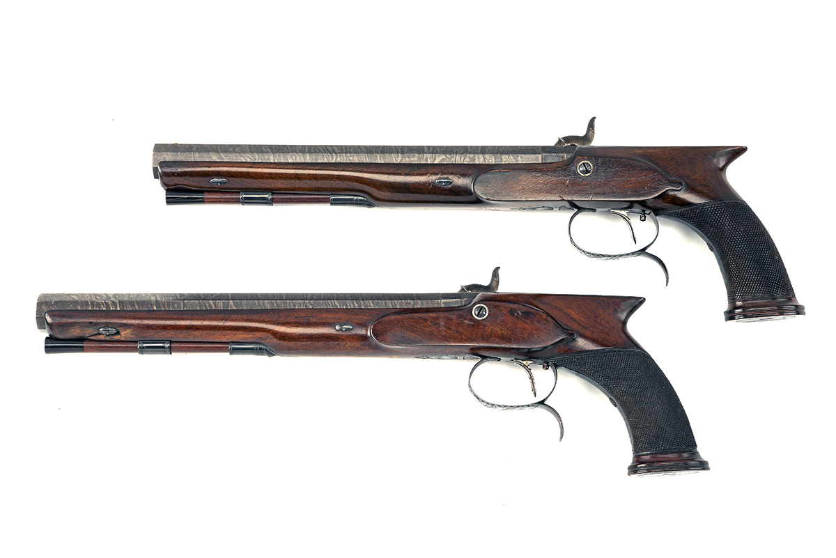 circa 1809, with later conversion to percussion probably by the manufacturer, rebrowned 10 1/4in. octagonal barrels signed 'H.W. MORTIMER & SON' over 'GUN MAKERS TO HIS MAJESTY', dove-tailed fore-sights, standing notch rear-sights to the front of the engraved and grooved top-tangs, engraved colour hardened breech-blocks, border and scroll engraved re-colour hardened locks signed 'H.W. MORTIMER & SON', further trophy engraved to the tails, scroll engraved hammers, walnut full-stocks with chequered saw-handled grips and swollen flat-based pommels, engraved oval iron caps, set triggers with engraved spurred trigger-guards also marked '89 FLEET ST'T' and horn tipped ramrods with tool ends, together with a possibly later oak case lined and compartmented in green baize ( some compartments loose) and containing a turn-screw and nipple-key, a scissors ball-mould, a later flask and sundry other accessories
