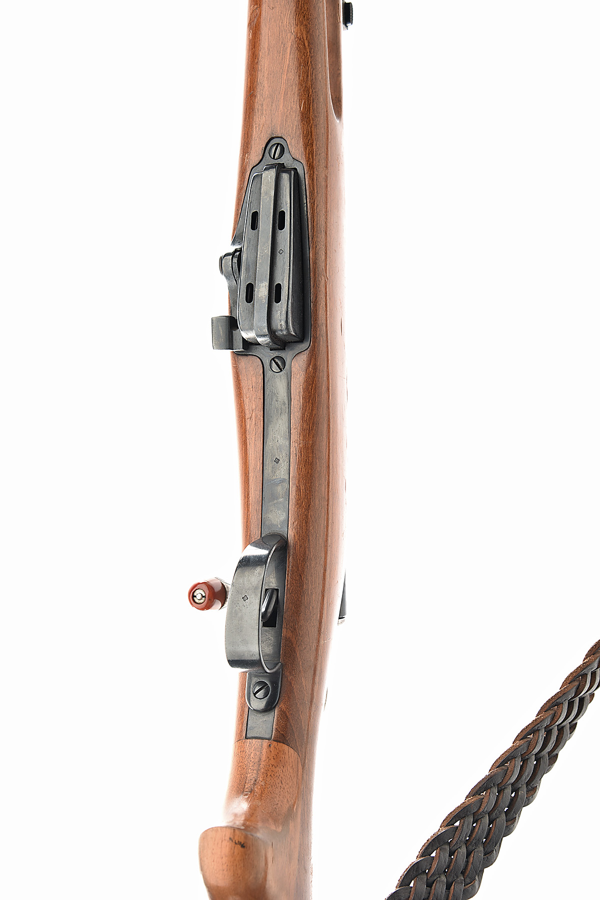 for 1892, 30 1/2in. nitro reproved (in 2022) barrel, numbered 3319, dove-tailed blade fore-sight, tangent rear-sight, manual ring safety, fluted action retaining much blued finish, full-length walnut stock, two barrel bands, 12in. pull including steel buttplate, leather sling, weight 10lb. 9oz.