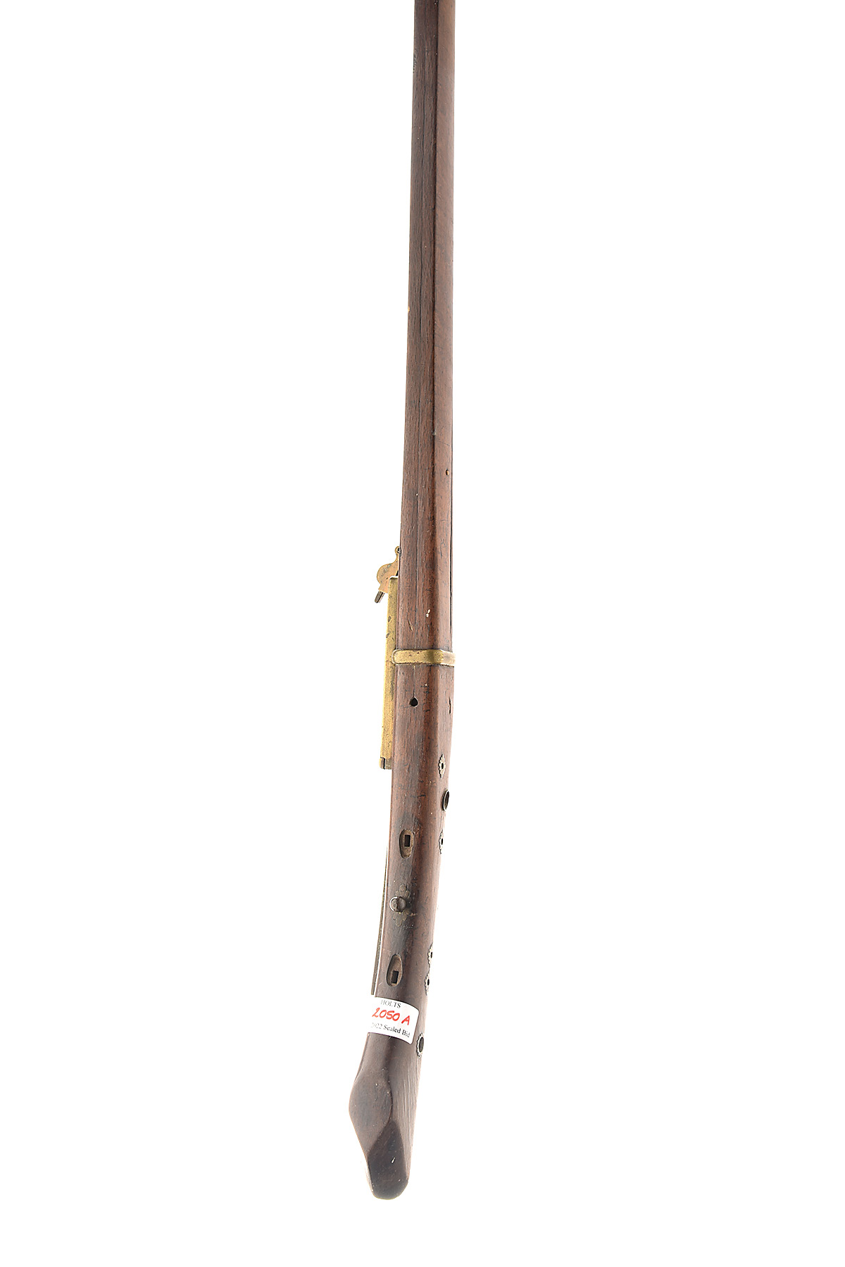 A 28-BORE MATCHLOCK MUSKET, UNSIGNED, MODEL 'JAPANESE TANEGASHIMA', no visible serial number, late Edo period with octagonal 41 3/4in. iron barrel, block fore-sight, rear-sight block, brass barrel retaining band at breech, swinging brass pan-cover, plain elongated brass lockplate with large external brass mainspring (missing some screws), hand-cocked serpentine match-holder, wooded full-stock of classic form with isolated brass decoration and floral escutcheoned match apertures, ball trigger missing guard, further brass muzzle-band to the middle, possible replacement under-barrel ramrod