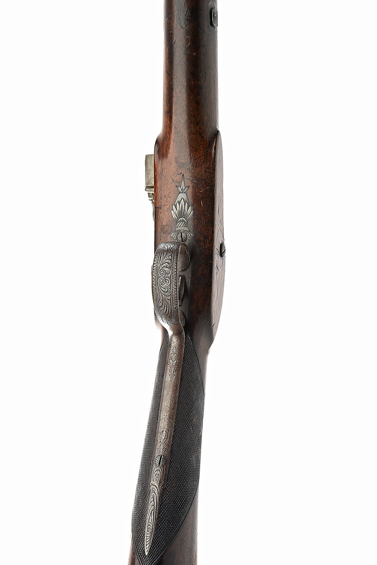 AN 8-BORE PERCUSSION TUBE-LOCK FOWLING-PIECE SIGNED GULLEY, LONDON, no visible serial number, with octagonal to sixteen-sided to round 36in. barrel, engraved breech-block and top-tang, plain flat lock, walnut half-stock chequered at the wrist (large inlet repair forwards of lock) and iron furniture