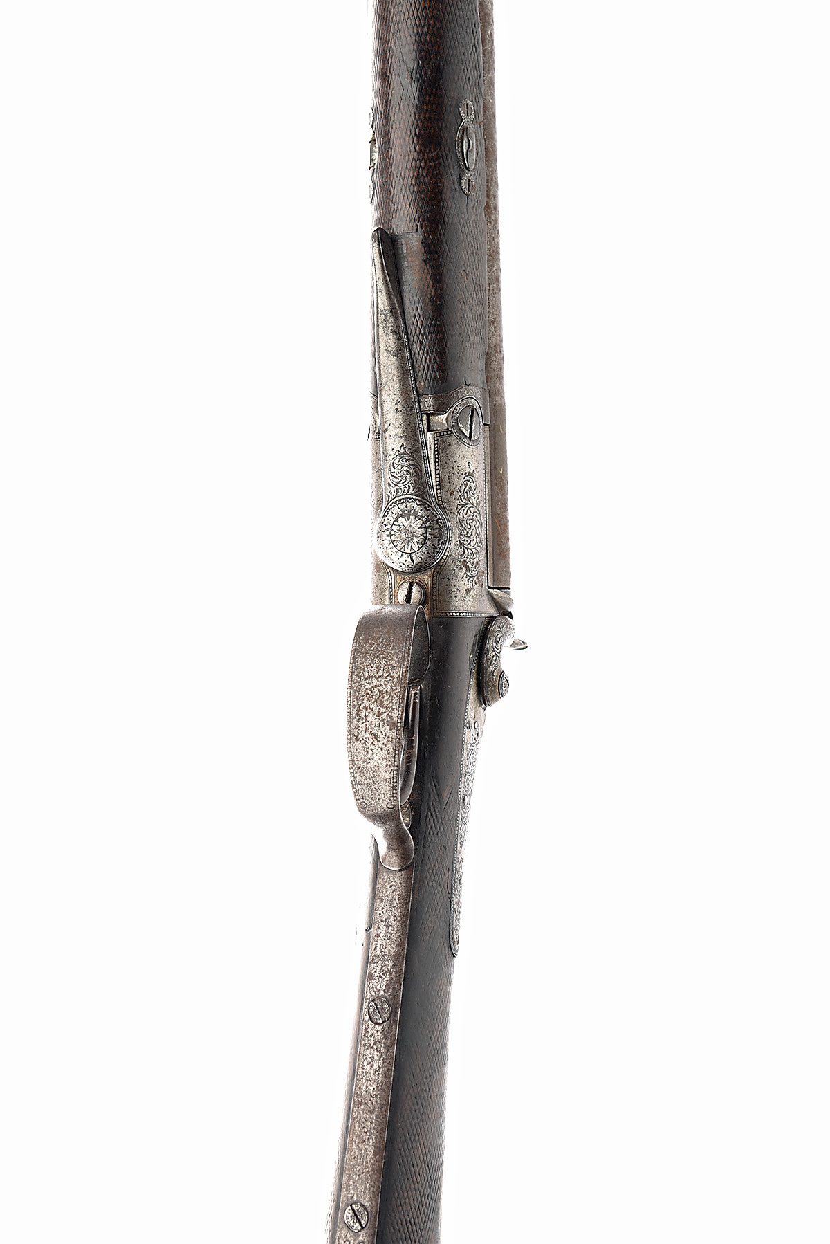 A 16 BORE PINFIRE DOUBLE BARRELLED SPORTING GUN BY J. LANG OF LONDON, CIRCA 1860, serial no. 2738, 20 in. barrels, foliate engraved fixed breech, round-bodied Le Faucheux action with foliate engraving, foliate decorated back-action locks with makers name 'J. LANG' to centre, hammers engraved to match, two piece figured walnut stock with chequered wrist and forend, the short barrel length might indicate it was used as a scrub gun, worn overall