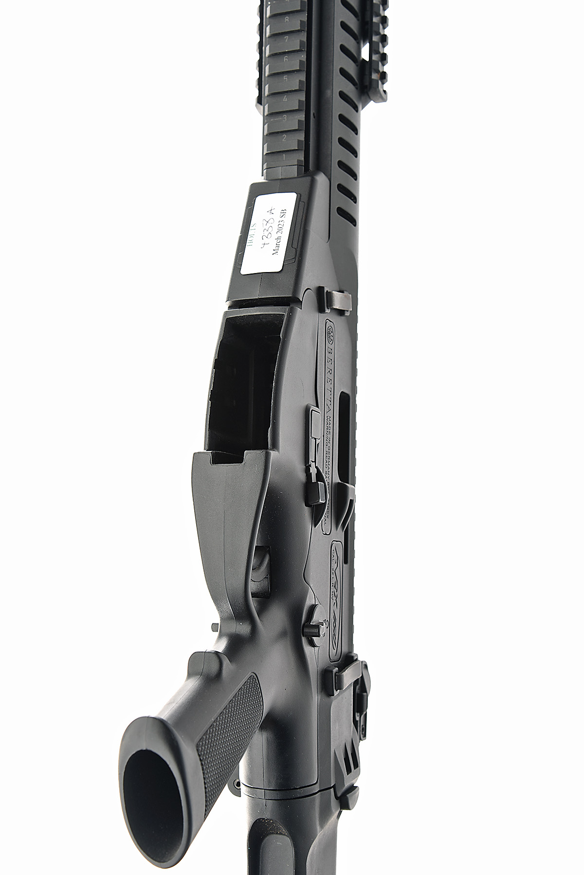 , 19 1/2in. nitro barrel, flip-up sights, scope rail, manual safety, detachable magazine missing, tactical type stock