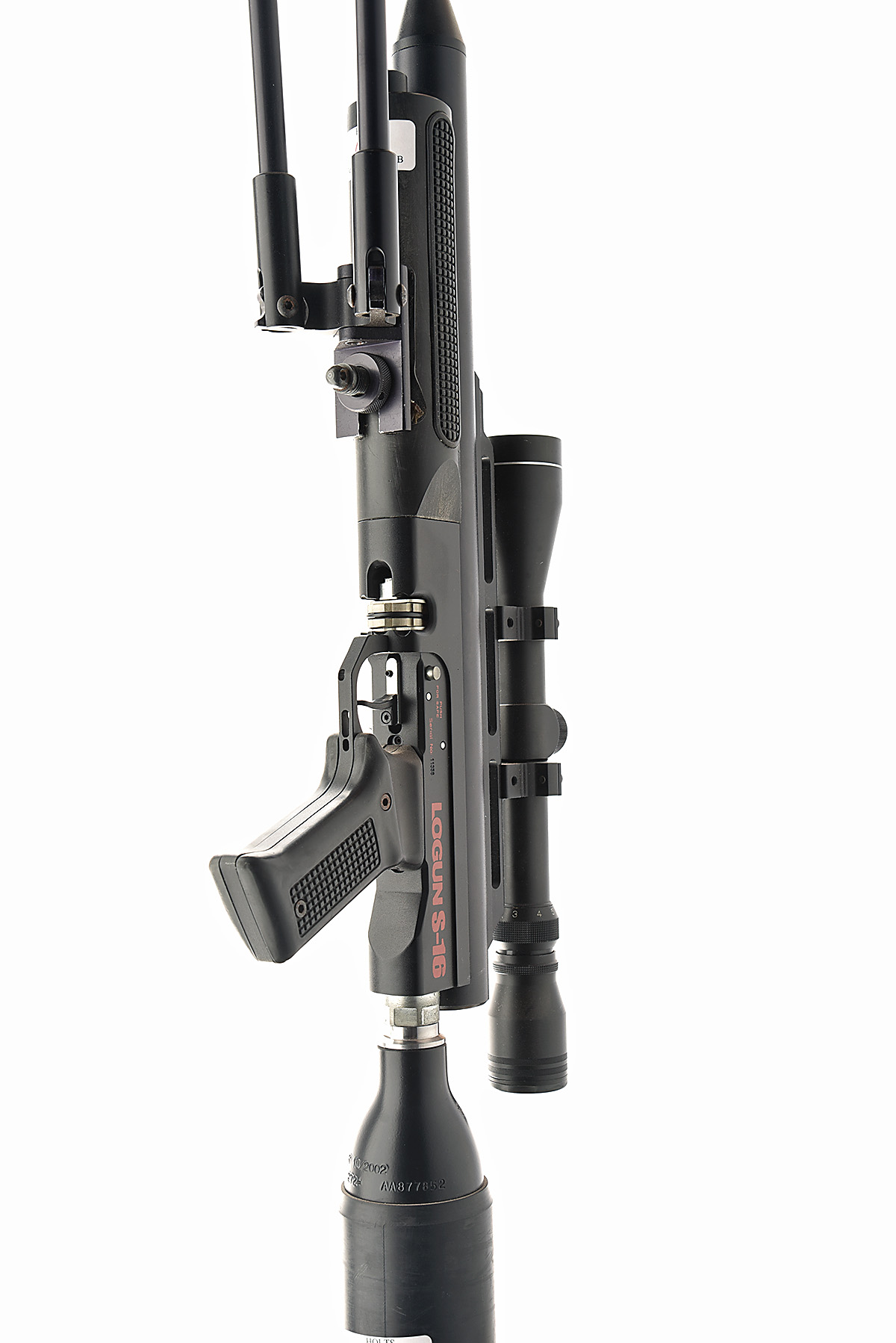 A .22 PRE CHARGED PNEUMATIC BULLPUP AIR RIFLE SIGNED LOGUN MODEL S-16, serial no. 11358,
