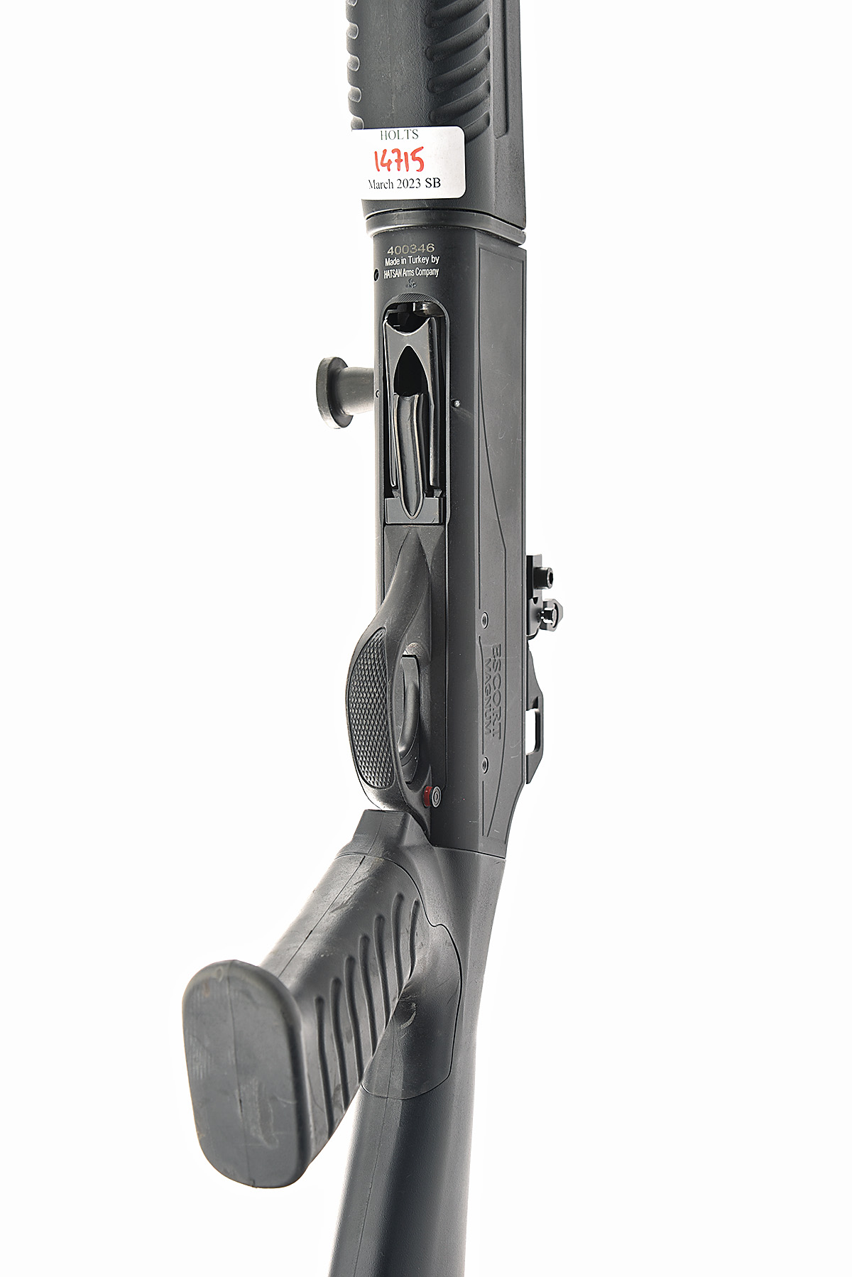 AN F.A.C HATSAN 12-BORE (3IN.) 'ESCORT MAGNUM' SEMI-AUTO SHOTGUN, serial no. 400346, circa 2014, extended tubular magazine, 24in. steel-shot proved nitro barrel, ramp-mounted bead fore-sight, receiver with accessory fail and adjustable rear sight, 3in. chamber, multichoke (no spares), manual push-button safety, magazine cut-off switch, 14 1/2in. synthetic pistolgrip stock including ventilated rubber recoil pad