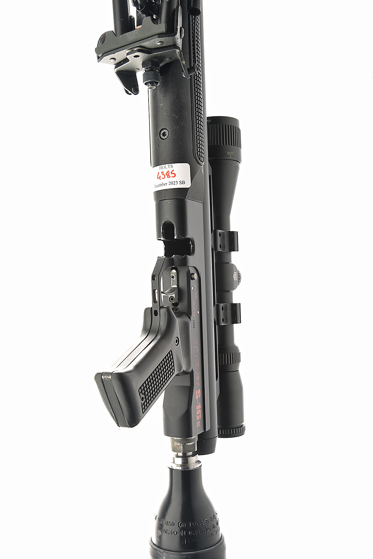A .22 PRE-CHARGED PNEUMATIC AIR-RIFLE, SIGNED LOGUN 'MODEL S-16', serial no. 18585, 23in. shrouded barrel including sound moderator, receiver with raised rail and fitted with a Nikko Stirling Mountmaster 3-9x40 AO telescopic sight, manual push-button safety, detachable magazine (present), black rubberised grip, rear buddy bottle acting as stock, folding bipod, untested, in its Logun canvas slip with filler adapter and instruction manual and canvas sling