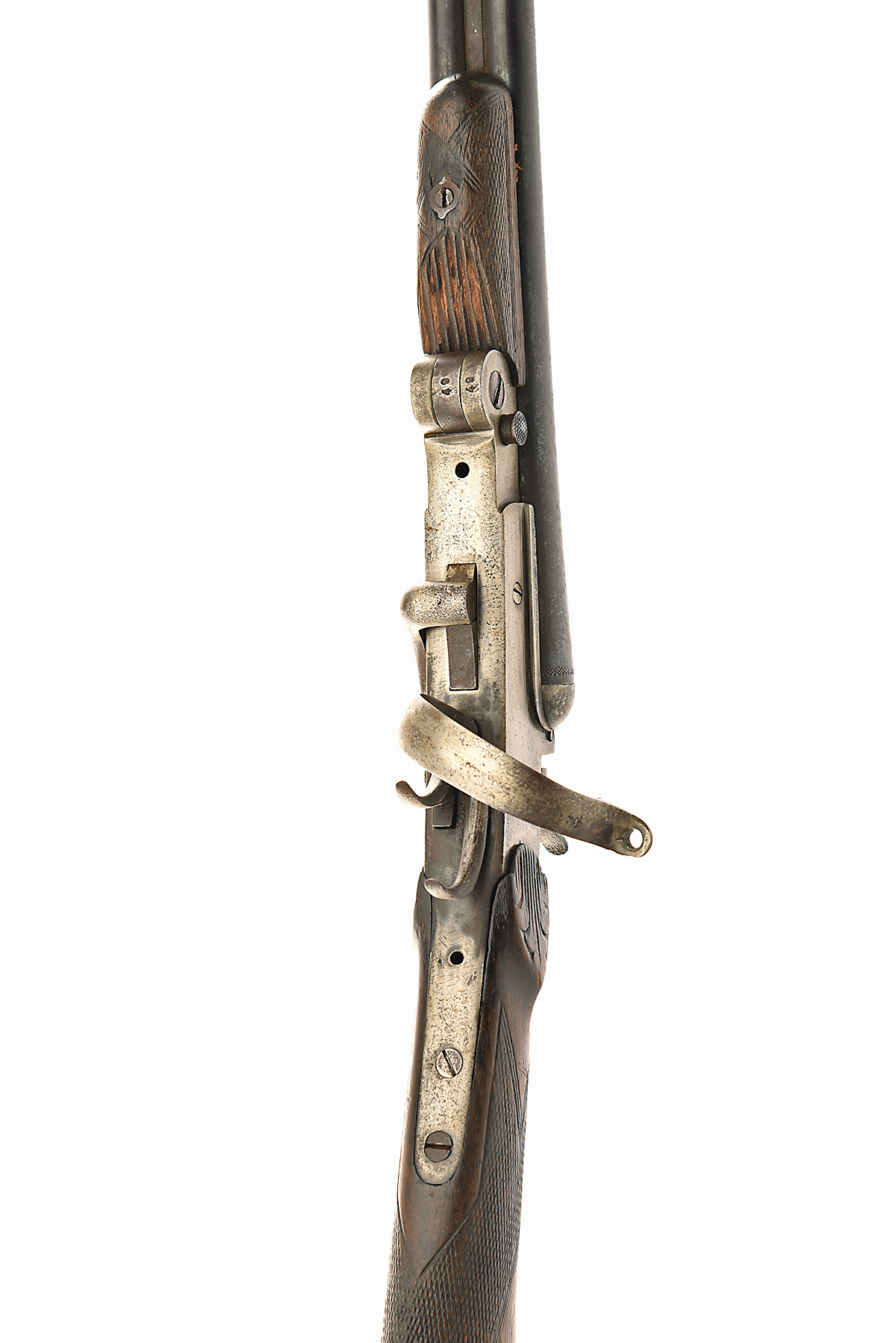 BELGIAN .410 DOUBLE-BARRELLED SIDELEVER FOLDING HAMMERGUN, serial no. 49, circa 1900, 28in. black powder only barrels, sidelever spring missing