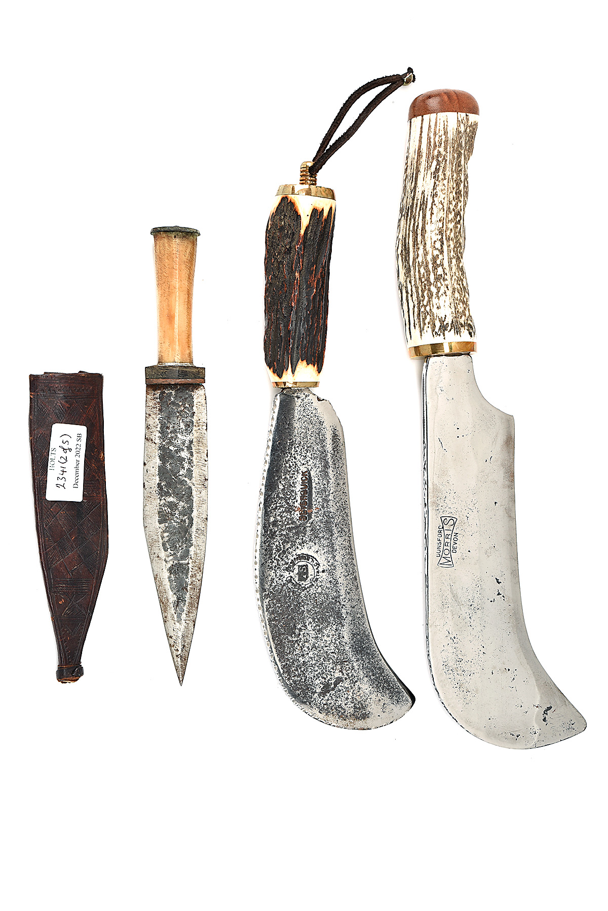 AN ASSORTED LOT COMPRISING TWO BILL HOOKS, ONE MACHETE, ONE AFRICAN DAGGER AND ONE GURKHA KUKRI, one bill hook with staghorn grips, the other with faux staghorn grips, blades polished bright, the machete dated 1843 and with replacement wooden grips, in replacement leather scabbard, the african dagger with bone grip, and embossed leather scabbard, kukri of tourist type with scabbard and one side knife