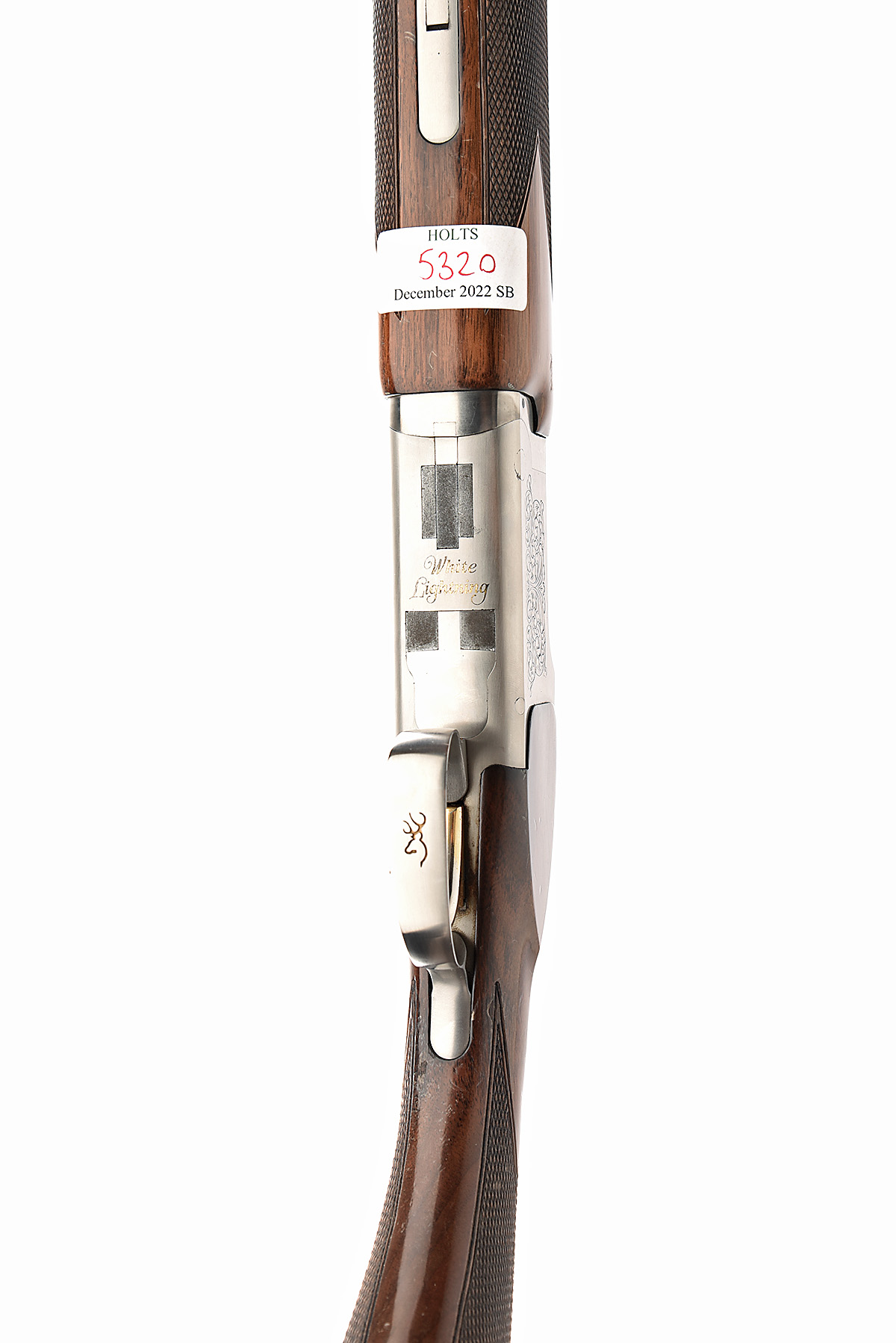 BROWNING 20-BORE (3IN.) 'WHITE LIGHTNING' SINGLE-TRIGGER OVER AND UNDER EJECTOR, serial no. 31301MR131, for 2007, 28in. steel-shot proved nitro barrels with 6mm raised ventilated matt top-rib, 3in. chambers, multichoke (no spares), applied 'SOUTH WEST SHOOTING.' sticker to the barrels, hold-open toplever, manual safety with integral barrel-selector switch, gold-washed trigger, scroll engraving, silver finish, 15in. semi-pistolgrip stock including rubber recoil pad, weight 6lb. 15oz.