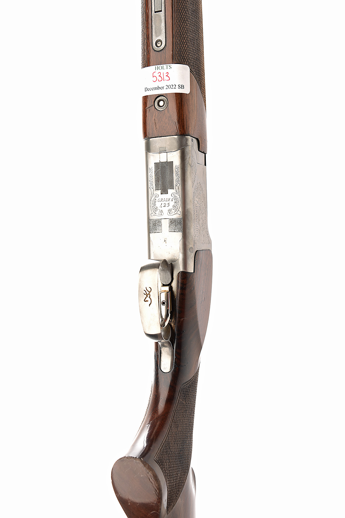 BROWNING 12-BORE '425 GRADE 1' SINGLE-TRIGGER OVER AND UNDER EJECTOR, serial no. 29573NR, dated 1997, 30in. nitro barrels with 10mm ventilated matt rib, 2 3/4in. chambers, multichoke (no spares), 'SOUTH WEST SHOOTING' sticker applied, hold-open toplever, manual safety with integral barrel-selector switch, adjustable gold-washed trigger, acanthus scroll engraving, bright finish, 14 3/4in. pistolgrip stock (cracked at hand) including buttplate, weight 7lb. 12oz.