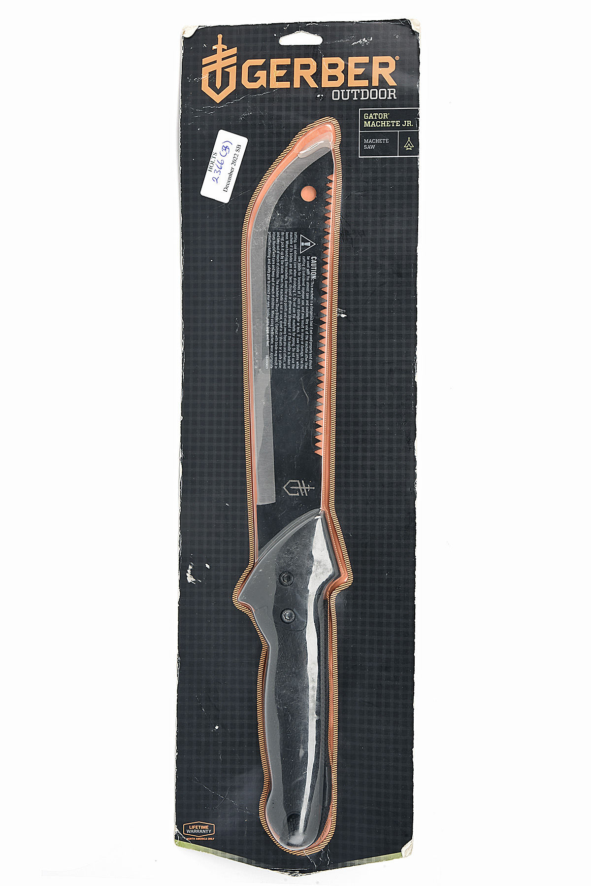 A GERBER GATOR MACHETE, A BLACK BOX BOLLO KNIFE, AND A LARGE HUNTING KNIFE, the first with 11 1/2in blade with sawback, complete with sheath and contained in its original carton, the second with 11in. Bolo type blade etched 'BLACK FOX', with two piece wooden grips with its brown leather sheath, as new, the third made up with an old 9 1/2in. blade stamped 'CORNBLUIS / WHITEHOUSE 7 SONS / CANNOCK 1914' brass cross-guard and curved staghorn grip, contained in its shaped leather sheath,