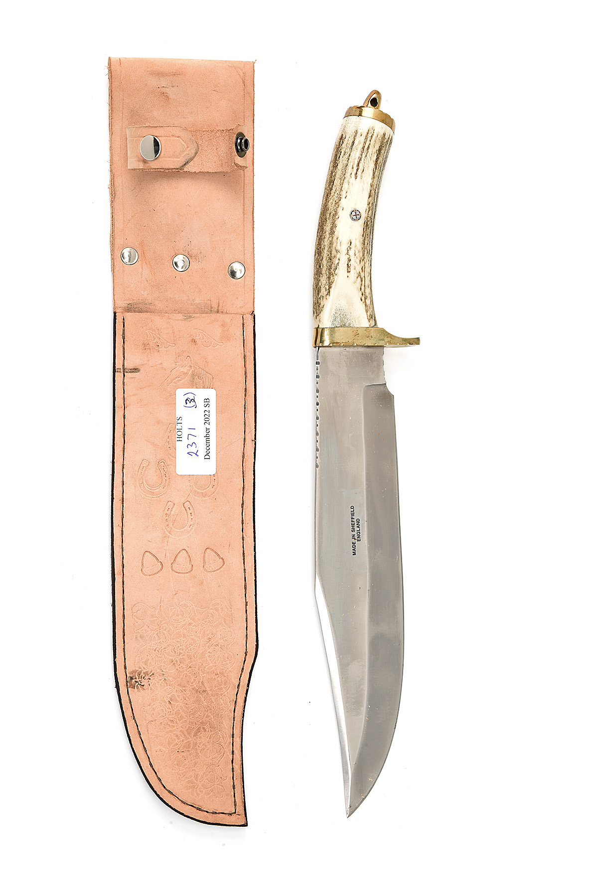 THREE LARGE BOWIE KNIVES IN AS NEW, the first two almost identical with 9 1/2in. blades, one etched 'MADE IN SHEFFIELD' the other unmarked, and both with brass mounted curved staghorn grips, the third with 10 in. blade etched with Wolstenholm eagle over 'HANDCRAFTED IN SHEFFIELD', two piece grips wooden grips, all three complete with their leather sheaths and in unused condition, these were expensive items