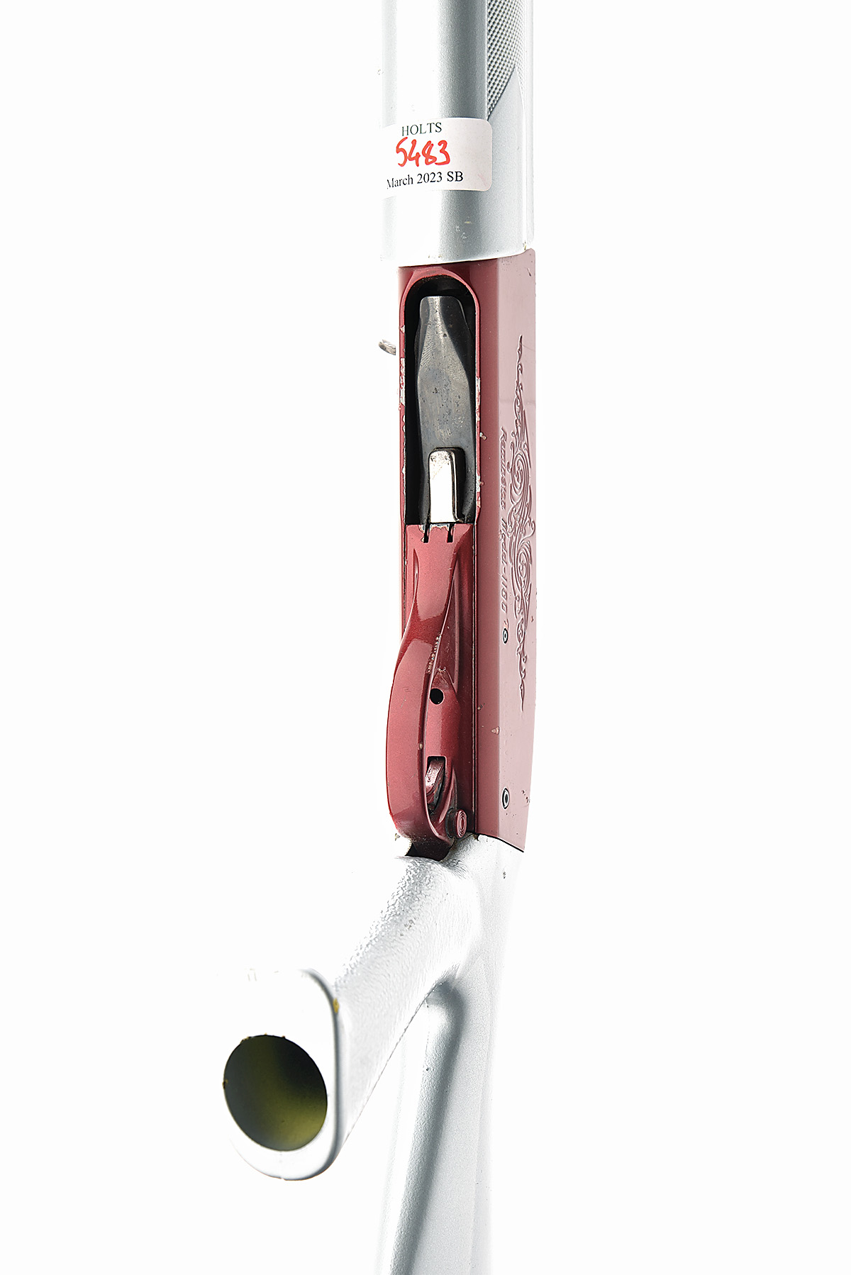 circa 1975, restricted magazine, 25 3/4in. nitro reproved (2016) barrel including cutts compensator with 7mm ventilated matt rib, 2 3/4in. chamber, action engraved with acanthus scroll work, the bolt carved en-suite, 13 1/2in. synthetic pistolgrip stock, the whole with candy apple red and dolphin blue finish