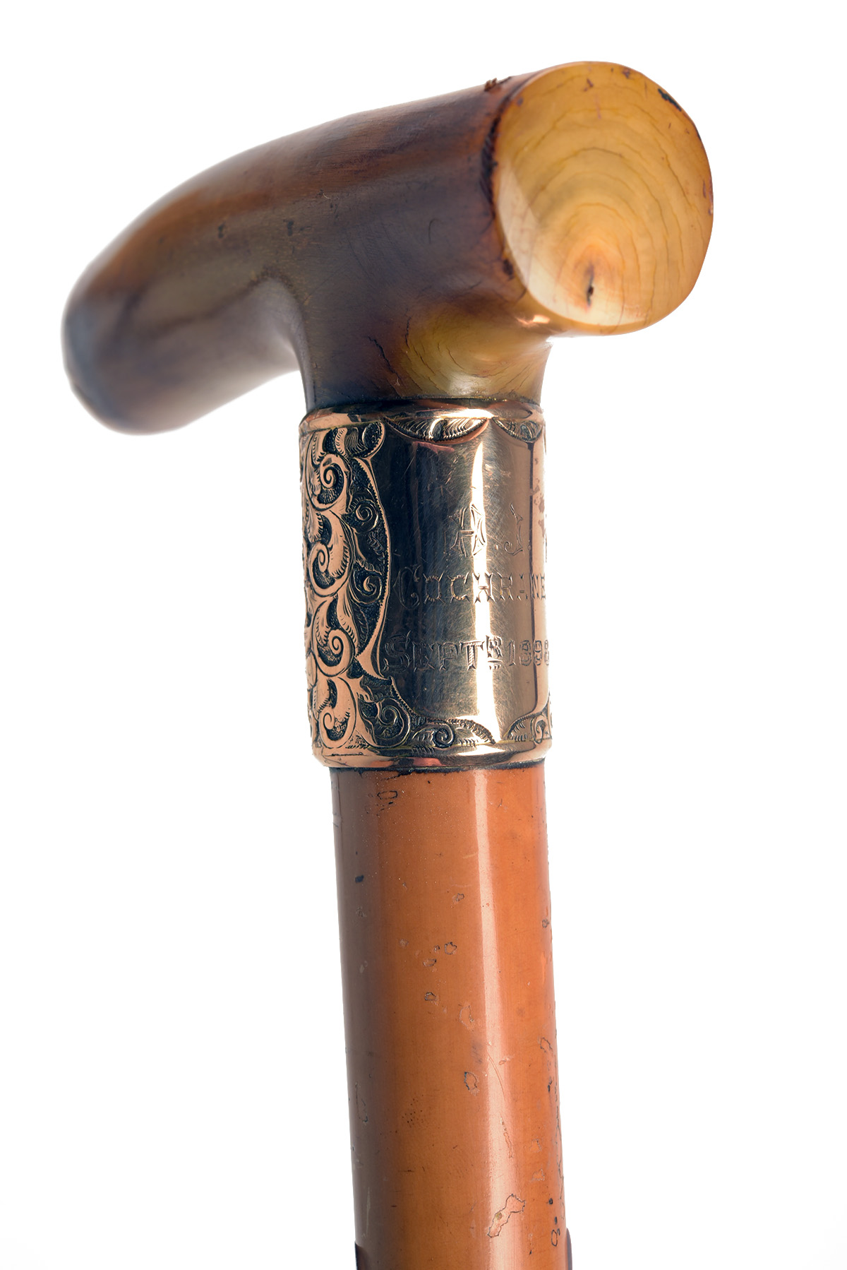 A 9K GOLD MOUNTED WALKING STICK, with Birmingham hallmarks for 1892, with horn tipped 34 1/2in. shaft, large scroll embossed 9k gold collar marked 'A.J. COCHRANE SEPT'R 1898' and 'T' bare horn handle