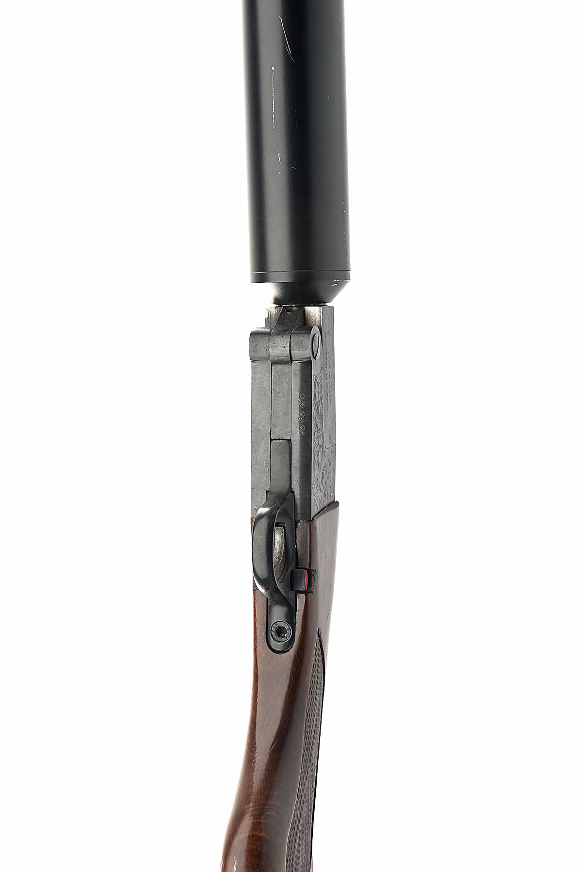 GUNSPORT HUSHPOWER 12-BORE FULLY-MODERATED SINGLE-BARRELLED SHOTGUN, serial no. A02610, circa 1992, 31in. nitro barrel including 28in. moderator, 2 3/4in. chamber, acanthus scroll and floral engraving, blacked finish, 13 1/2in. semi-pistolgrip stock