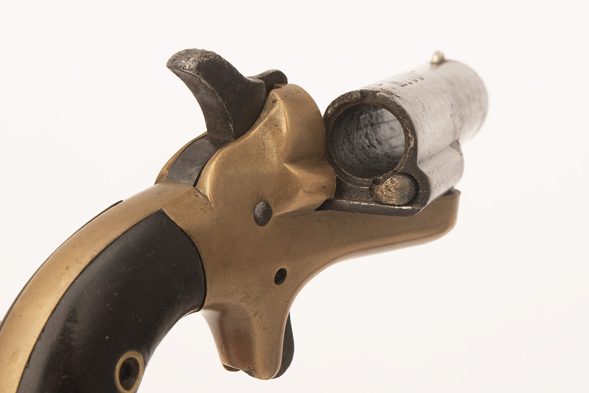 A .41 RIMFIRE COLT No.3 THUER PATENT DERRINGER VEST-PISTOL, no visible serial number, circa 1875, with 2in. swing-sideways barrel, brass open frame, spur trigger and smooth walnut birdshead grips, cleaned of finish with some pitting to iron parts
