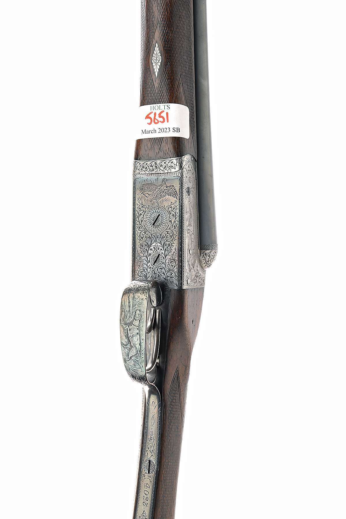THOMAS HORSLEY 12-BORE BOXLOCK EJECTOR, serial no. 4023, for 1923, 25in. nitro reproved (in 1968) barrels, with Churchill-style rib engraved 'THOMAS HORSELY. GUNMAKER. YORK.', 2 1/2in. chambers, bored approx. imp. cyl. and 1/2 choke, automatic safety with gold-inlaid 'SAFE' detail, border, and cold acanthus scroll engraving surrounding scenes of hounds flushing pheasant and partridge, the underside with a woodcock, bright and reblued finish overall, 14 1/2in. figured stock (slight cast on for the left shoulder), weight 5lb. 15oz.