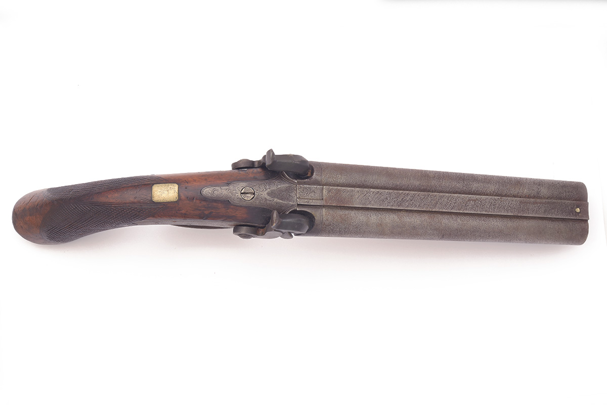 A 16-BORE PERCUSSION DOUBLE-BARRELLED HOWDAH-PISTOL, UNSIGNED, no visible serial number,