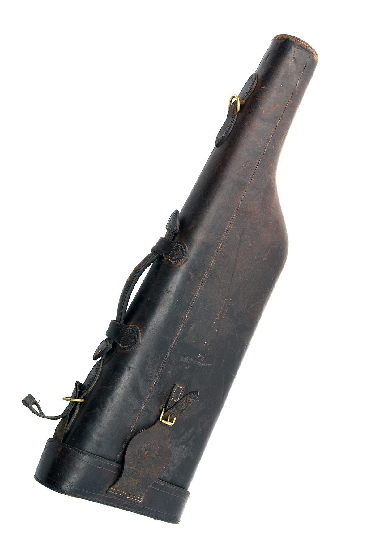 A BRASS-CORNERED CHESTNUT BROWN LEATHER DOUBLE GUNCASE,