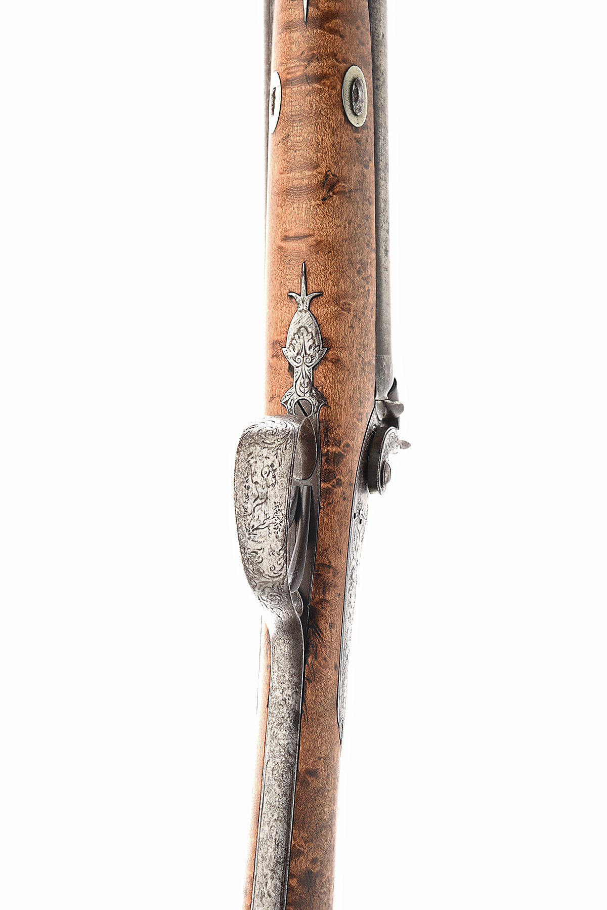 A 12-BORE PERCUSSION DOUBLE BARRELLED SPORTING GUN BY STIRLING, CIRCA 1850, no visible number, 28 in. skelp twist barrels with two inset gold lines at breech and engraved with gamebirds, foliate engraved long fixed breech tang, borderline engraved back-action locks also attractively decorated with gamebird and hunting scenes, half stocked in maple with engraved iron mounts, worn overall, top rammer pipe and rod missing.