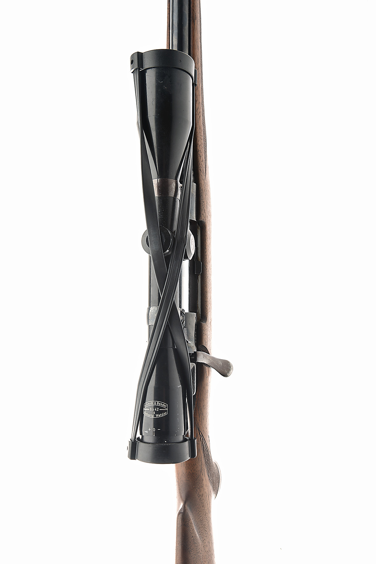 ** MANNLICHER SCHOENAUER 6.5X57 'M72' BOLT-MAGAZINE STUTZEN SPORTING RIFLE, serial no. 4897 for 1974, 20in. nitro barrel, open sights removed, ramp-mounted bead fore-sight, the receiver mounted with a Schmidt & Bender 6x42 telescopic sight, serial no. 21607, set triggers, losses to blued finish, pistolgrip stock with cheekpiece and monte carlo comb, sling swivels, 14 1/8in. pull including 7/8in. recoil pad