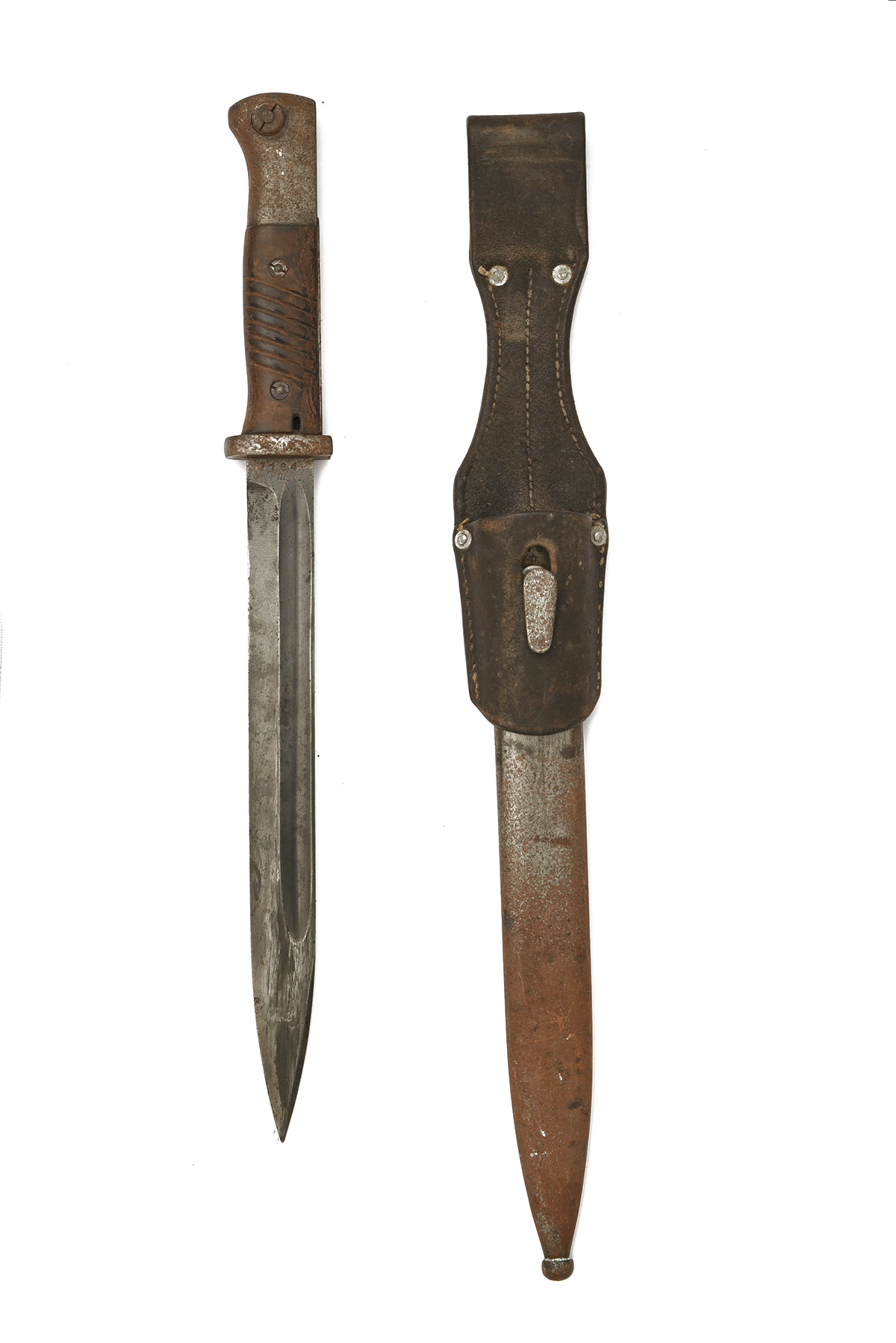 A MIXED GROUP OF THREE BAYONETS, being 1) 1942 dated German for the Mauser K98k carbine, with 10 in. single edged steel blade fullered on each side, ricasso marked '42 fnj [for Alexander Coppel, Solingen] with '7164 / m' over, Bakelite grips, pommel with Waffenamt stamps, together with its matching numbered scabbard and black leather frog, 16 1/2 in. overall; 2) 1917 dated Pattern 1913 sword bayonet for the SMLE rifle with 17 in. single-edged steel blade fullered on each side, ricasso marked '1913 / 3 17 / REMINGTON' with inspection marks over, no scabbard, 21 3/4 in. overall; 3) early 20th Century French Model 1892 for the Mannlicher-Berthier Shot Rifle, 16 in, single-edged steel blade fullered on each side, inspection marks to ricasso, steel cross-guard with quillion, rivited wooden grips, together with its steel scabbard, pommel missing the release stud, 20 3/4 in. overall; all three worn with rusting