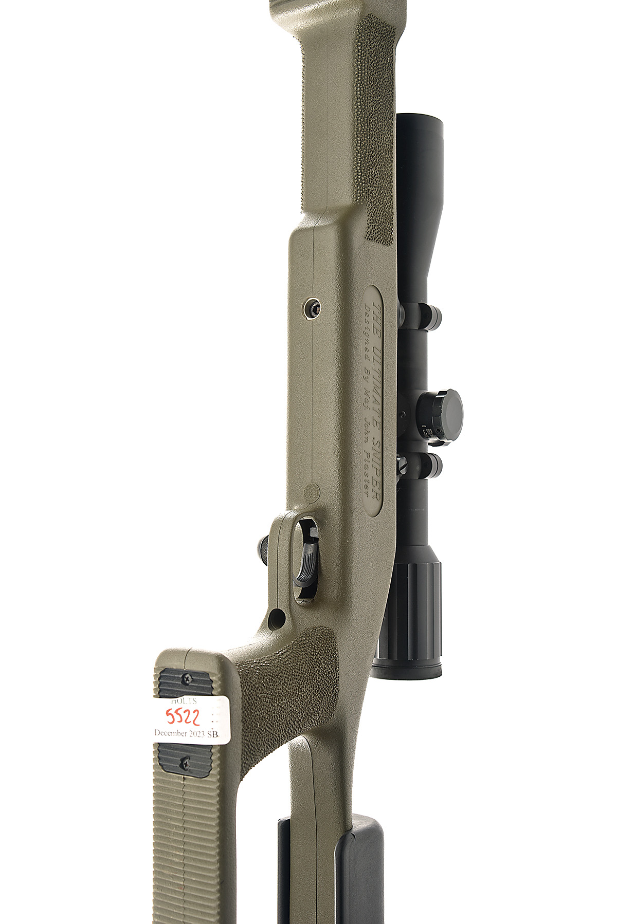 REMINGTON .308 WIN. 'MODEL 700' BOLT-MAGAZINE SNIPER RIFLE, serial no. G6284908, circa 2003, 26 3/4in. unsighted heavy nitro barrel, receiver fitted with a n SS10x42M telescopic sight, sserial no. 0280, manual safety, internal magazine (no access to underside), an a synthetic pistolgrip halfstock marked to the left 'THE ULTIMATE SNIPER. DESIGNED BY MAJ. JOHN PLASTER.', beavertail fore-end fitted with a folding Harris bipod, with cheekpiece adjustable rear balance, 14in. pull including ventilated rubber recoil pad, sling swivels, weight 15lb. 2oz. (scoped)