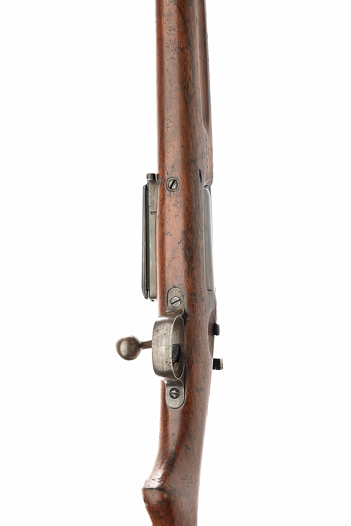 * KONGSBERG VAPENFABRIK 6.5x55MM KRAG 'KRAG JORGENSEN M1894 (LANG KRAG)' BOLT-MAGAZINE SERVICE RIFLE, serial no. 85392, dated 1909, 30in. nitro reproved (in 2023) barrel with tall block-mounted blade fore-sight, adjustable tangent rear-sight graduated from 1- 2200, receiver ring marked with the Kongsberg arsenal marking and '1909', internal rotary box magazine with downward pivoting loading gate and inspection trap, magazine cut-off with thumb cutout marked 'S' and 'AA', manual flag safety, manual cocking knob, three-quarter length semi-pistolgrip stock, receiver drilled for a scope mount, the fore-part with aperture for short cleaning rod, two barrel bands, the first band with sling swivel, second barrel band with stacking ring and hook for parade use , bayonet lug, 14in. pull including steel buttplate with central trapdoor, bolt and receiver matching numbers, weight 9lb. 2oz.