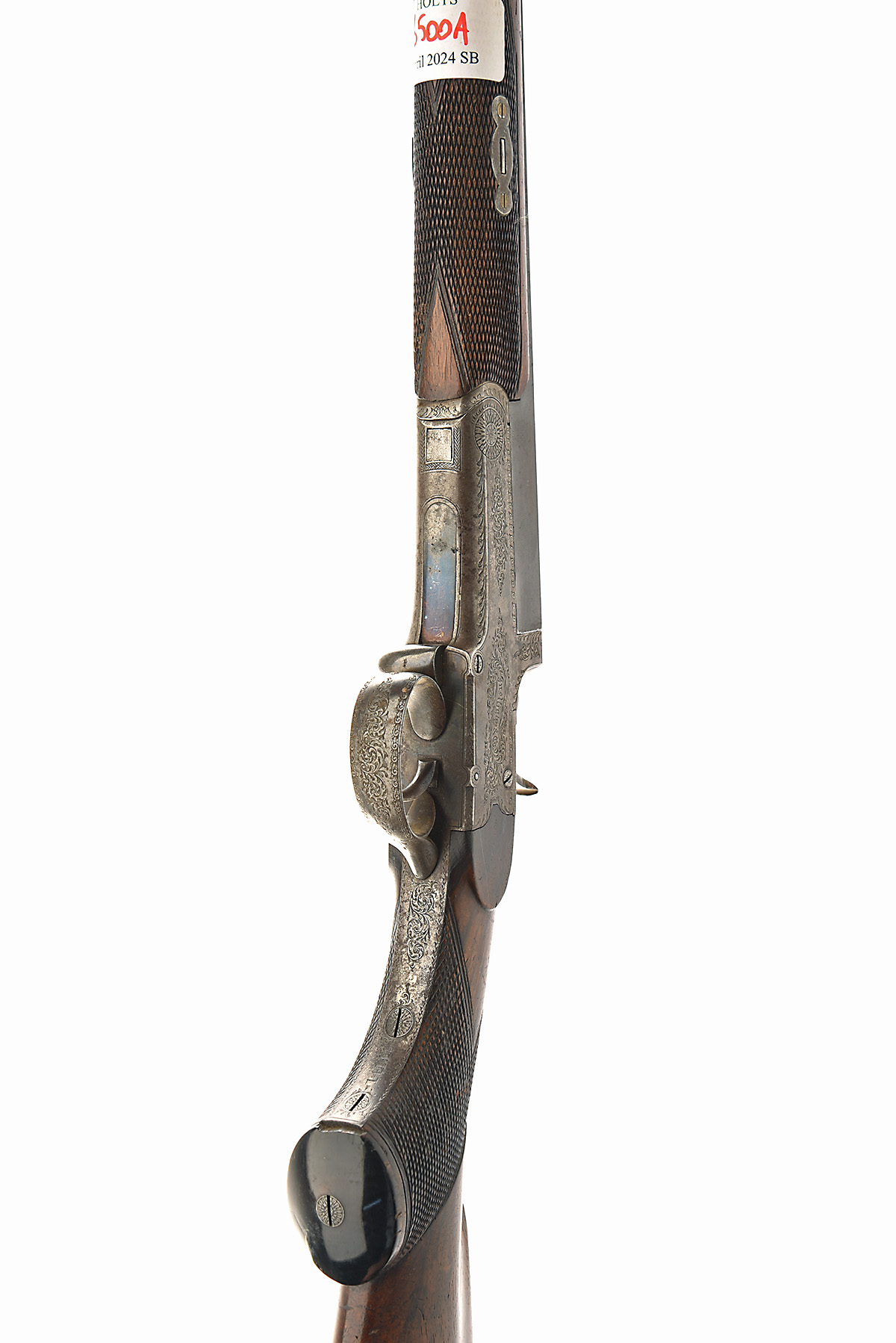 JNO. RIGBY & CO. .410 (SMOOTHBORED) SINGLE-BARRELLED SIDELEVER HAMMER ROOK RIFLE, serial no. 14144, circa 1870 and likely converted from needle-fire, 24in. turned octagonal to round nitro reproved blacked damascus barrel, the top flat engraved 'Jno. RIGBY & CO. 72 ST. JAMES'S. STREET. LONDON. AND AT DUBLIN.', rear sight removed and dove-tail inserted, and with acanthus scroll detailing at the breech-end, 2 1/2in. chamber, bored approx. 1/4 choke, central non-rebounding hammer, sidelever opening, border and acanthus scroll engraving, retaining very slight traces of original colour-hardening and finish, 14 1/2in. figured pistolgrip stock with horn pistolgrip cap and including steel buttplate, splinter fore-end with cross-pin release catch, weight 4lb. 6oz.