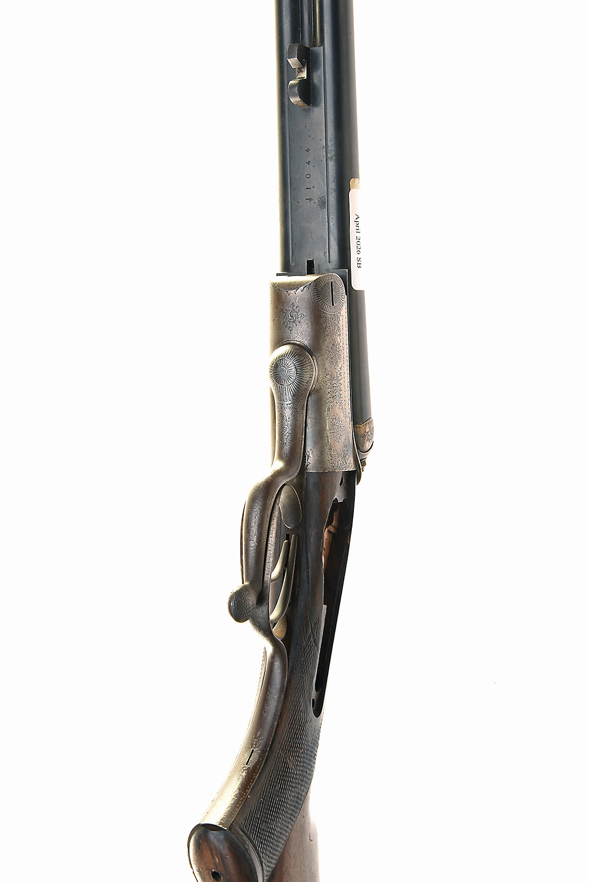 THE STOCK AND BARRELLED-ACTION ONLY OF A HOLLAND & HOLLAND .450 3 1/4IN. (B.P.E.) ROTARY-UNDERLEVER DOUBLE HAMMER RIFLE, serial no. 11044, circa 1886, 26in. black powder only barrels, standing notch rear sight with two folding leaf sights, marked for 150, 200 and 250 yards and with gold-inlaid sight lines, bead fore-sight (moon sight missing), the tubes engraved 'HOLLAND & HOLLAND. 98. NEW. BOND STREET. LONDON. WINNERS OF ALL THE "FIELD" RIFLE TRIALS. LONDON. 1883.', Jones patent rotary-underlever, action bar engraved 'CHARGE 4 DRAMS. CASE 3 1/4 INCHES.', acanthus scroll and floral bouquet engraving, retaining very slight traces of colour-hardening and finish, 14 1/8in. figured pistolgrip stock with cheekpiece, including buttplate, no fore-end, or locks present
