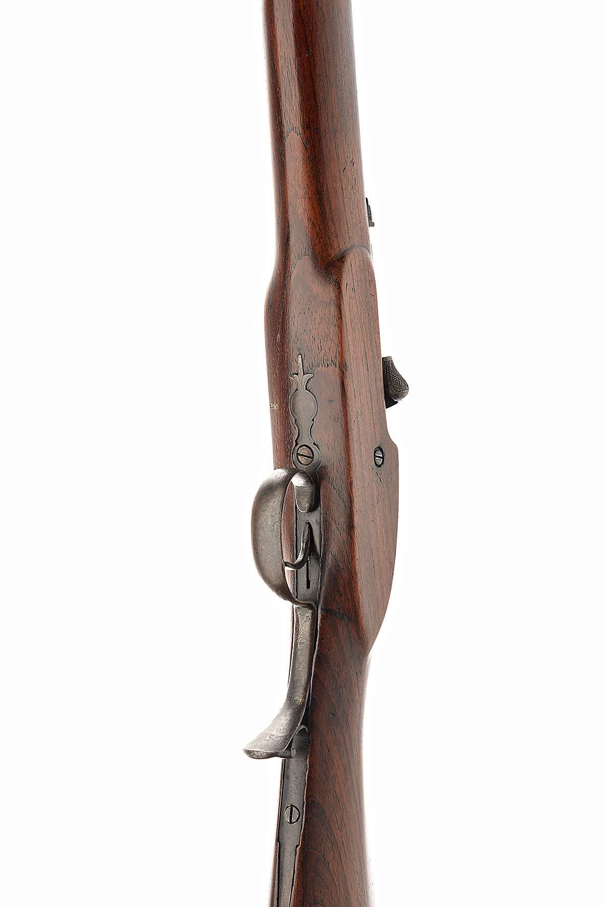 A .577 (2 1/2IN.) SNIDER MK III BREECH LOADING SPORTING RIFLE BY R. B. RODDA, no visible serial number, circa 1875, with 21in. London proofed barrel fitted with blade front-sight and leaf rear-sights, the top engraved ' R. B. RODDA / GUNMAKERS TO HIS EXCELLENCY THE VICEROY / LONDON & CALCUTTA', the Mk III positive bolt locked breech has been modified and extended and the breech aperture also lengthened exposing the action threads, modifying the rifle to accept the .577 2 1/2in. cartridge, sporting style lock with engraved border decoration and retailers name 'R. B. RODDA & CO', the rifle has been restocked, is fitted with iron scroll trigger-guard, iron nose-cap and barrel band, brass butt-plate.
