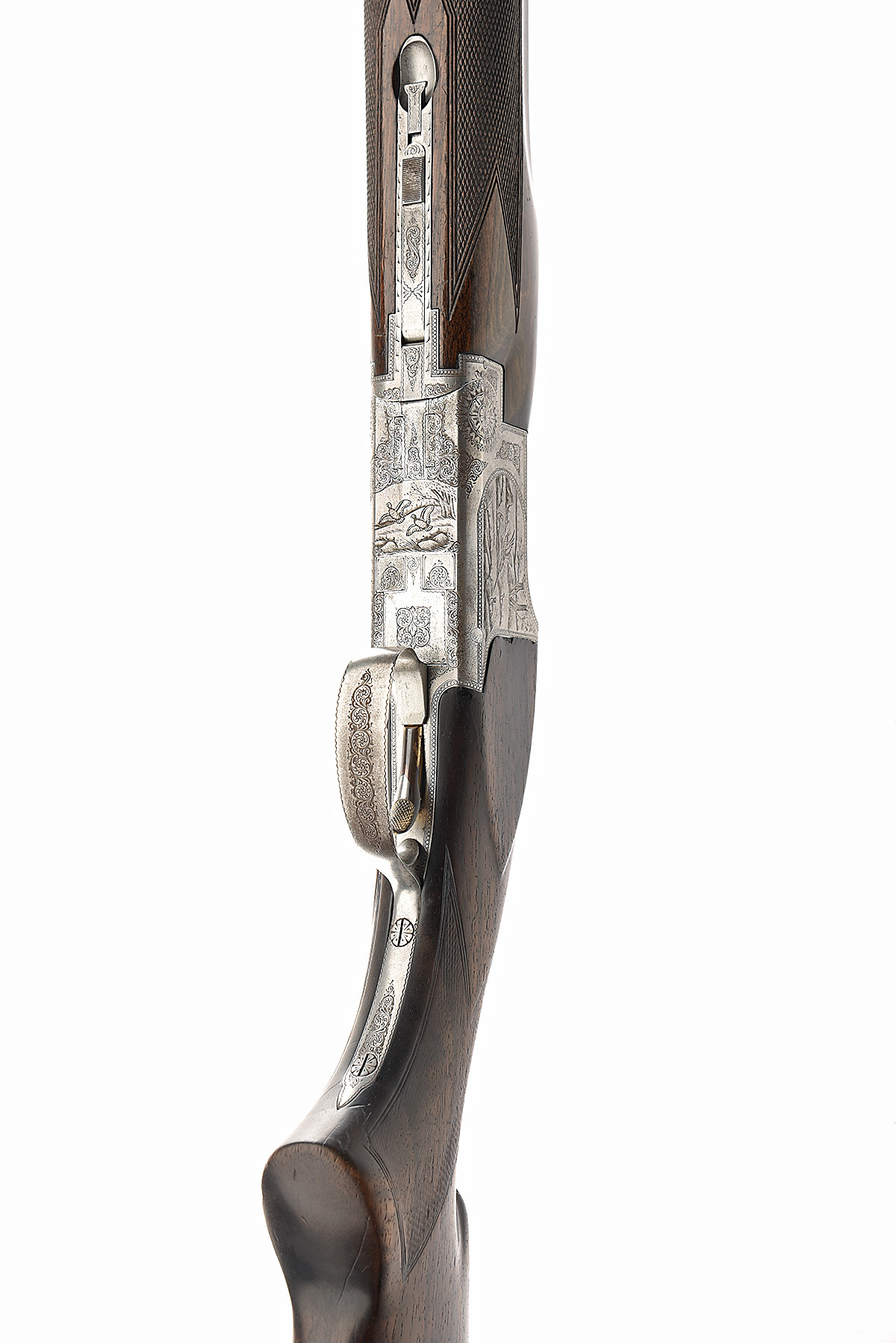 FABRIQUE NATIONALE 12-BORE 'B2' SINGLE-TRIGGER OVER AND UNDER EJECTOR, serial no. 64017 S77, dated 1977, 27 1/2in. nitro barrels (mid-rib loose) with 12mm ventilated matt top-rib, 2 3/4in. chambers, bored approx. imp. cyl. in both, hold-open toplever, manual safety with integral barrel selector switch, gold-washed single trigger, beaded border and partial acanthus scroll engraving surrounding vignettes of pheasant, capercaillie and partridge, 14 3/4in. pistolgrip stock (crack at head) including 1in. leather-covered recoil pad, weight 7lb. 6oz.