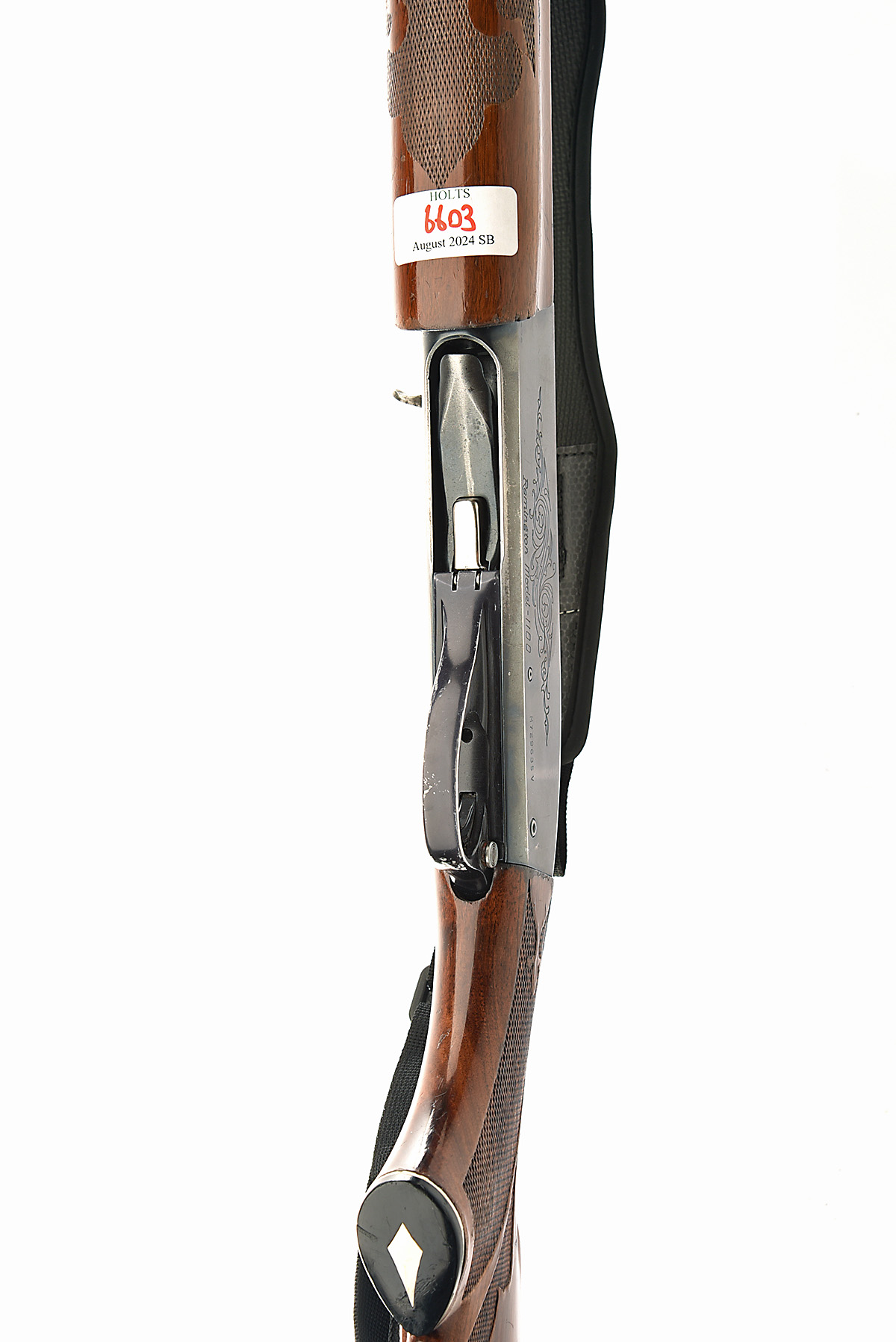 REMINGTON 12-BORE 'MODEL 1100' SEMI-AUTO SHOTGUN, serial no. M729635V, circa 1978, restricted magazine, 25 1/2in. nitro barrel with 8mm ventilated matt rib, 2 3/4in. chamber, bored approx. 1/2 choke, manual push-button safety, blacked action with partial acanthus scroll engraving, 14 1/4in. ornately chequered pistolgrip stock including buttplate, with applied rubber boot, canvas sling