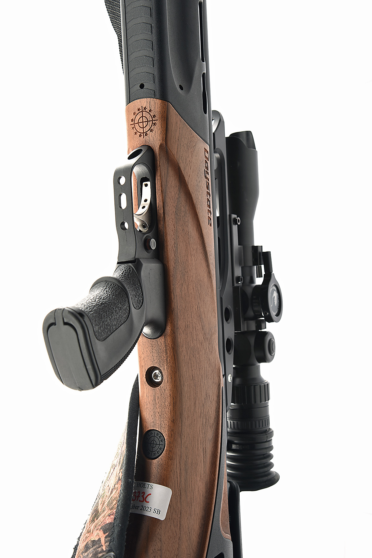 A .22 PRE-CHARGED PNEUMATIC BULLPUP AIR-RIFLE, SIGNED DAYSTATE 'PULSAR', serial no. NA 0288, 22 1/4in. unsighted barrel, with sound moderator, receiver fitted with a raised MTC Optics Viper X Series Connect 3-12x32 telescopic sight, bullpup action, missing magazine, digital display to left hand side, manual push-button safety, holding pressure, walnut and synthetic pistolgrip stock, 14 1/4in. pull with adjustable buttplate, canvas sling, in its ABS case