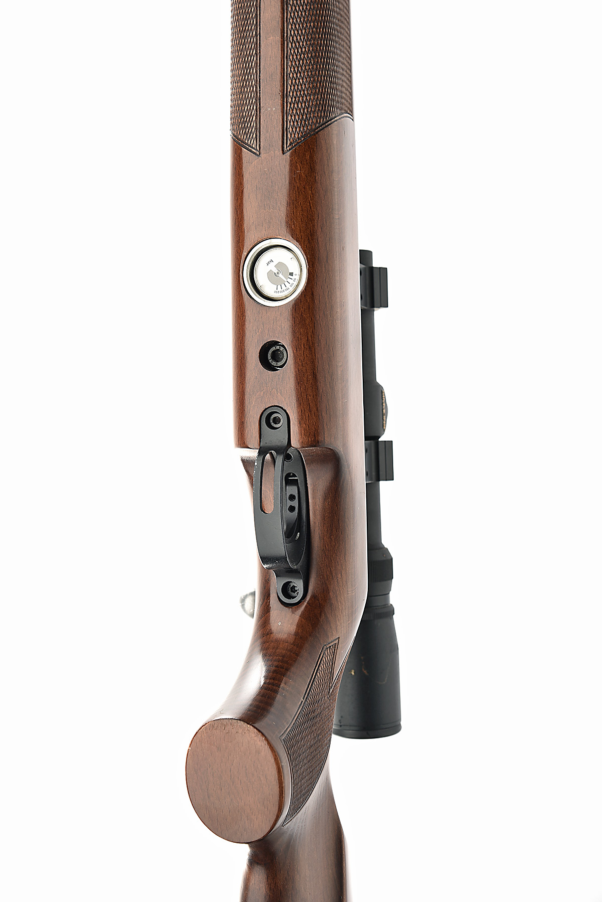 AN AIR-ARMS .22 PRE-CHARGED PNEUMATIC S400 CARBINE AIR-RIFLE, serial no. 034219, with 18in. barrel, bolt-action alloy single shot receiver, under-barrel air-chamber with some loss to finish and chequered beech three-quarter stock, tested, fitted with a Simmons Whitetail Classic 1.5-5x20 telescopic sight