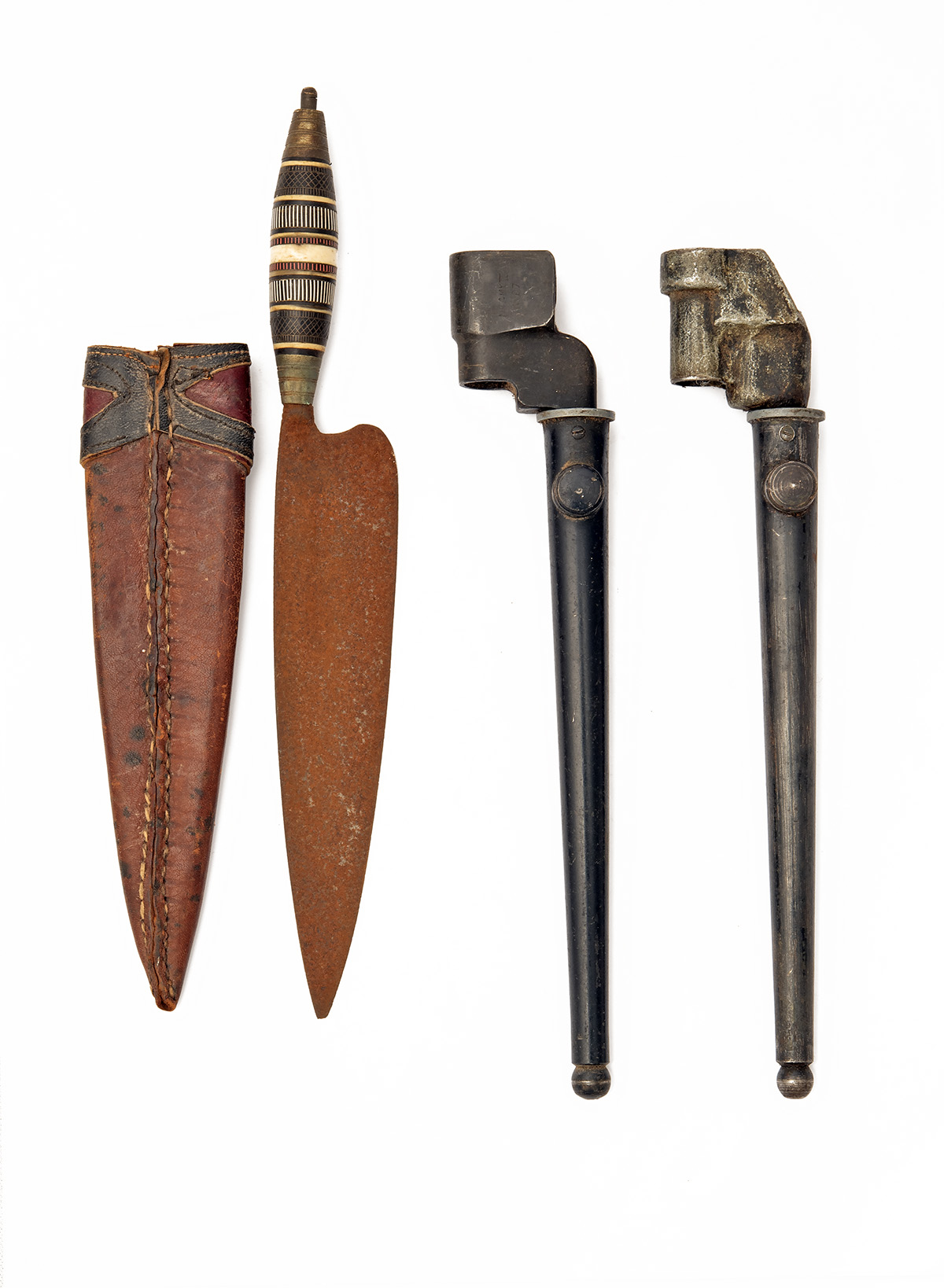 A MIXED GROUP OF SIX BAYONETS AND A KNIFE, includes World War II No. 4 Mark III and Mark II bayonets for the SMLE, a shortened French Model 1874, two German Model 1884/98 Mauser bayonets missing grips and release studs, a Siamese Type 46 bayonet with losses to grips, plus a rusted tourist knife