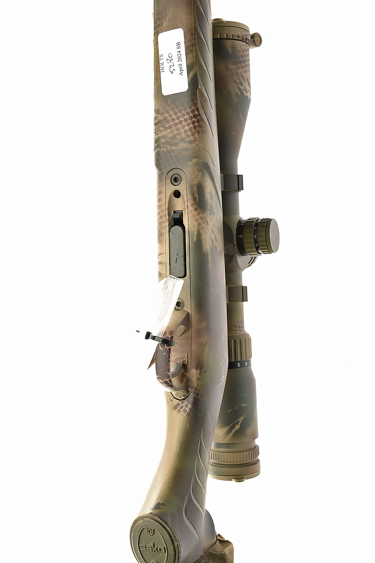 SAKO .22 L.R. 'P04R' BOLT-MAGAZINE SPORTING RIFLE, serial no. L46928, 22in. unsighted nitro barrel, threaded for sound moderator, fitted with an unsigned 4-16x50 telescopic sight, ,manual safety, 2 x detachable magazines, folding bipod with extendable legs, pistolgrip stock with recoil pad and taped cheek, fitted with a Wildcat Whisper .22 sound moderator, the whole rifle (including scope and moderator) has been camouflaged + sound moderator