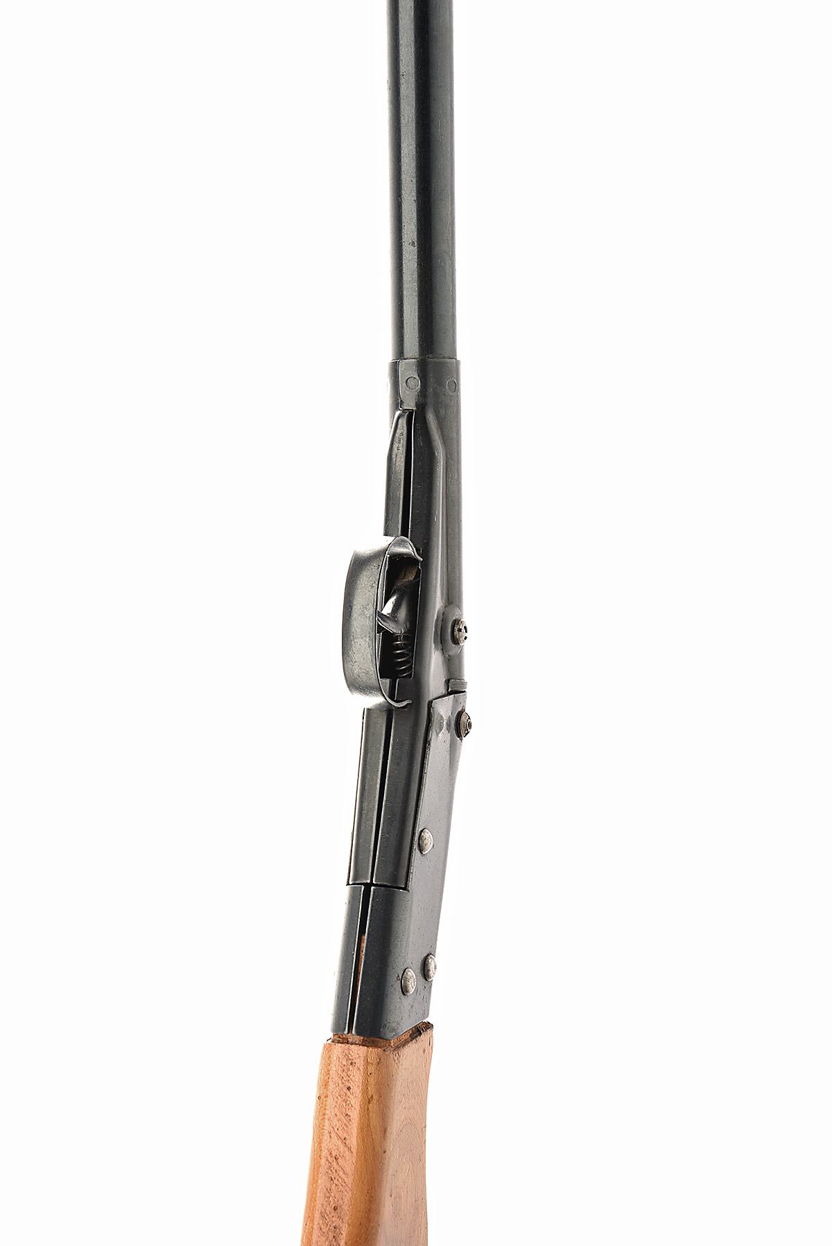 A TINPLATE MILBRO SCOUT .177 AIR-RIFLE, no visible serial number, with detach to load barrel, blued barrel-housing, tinplate receiver and pale beech plank butt-stock, generally collector's external condition