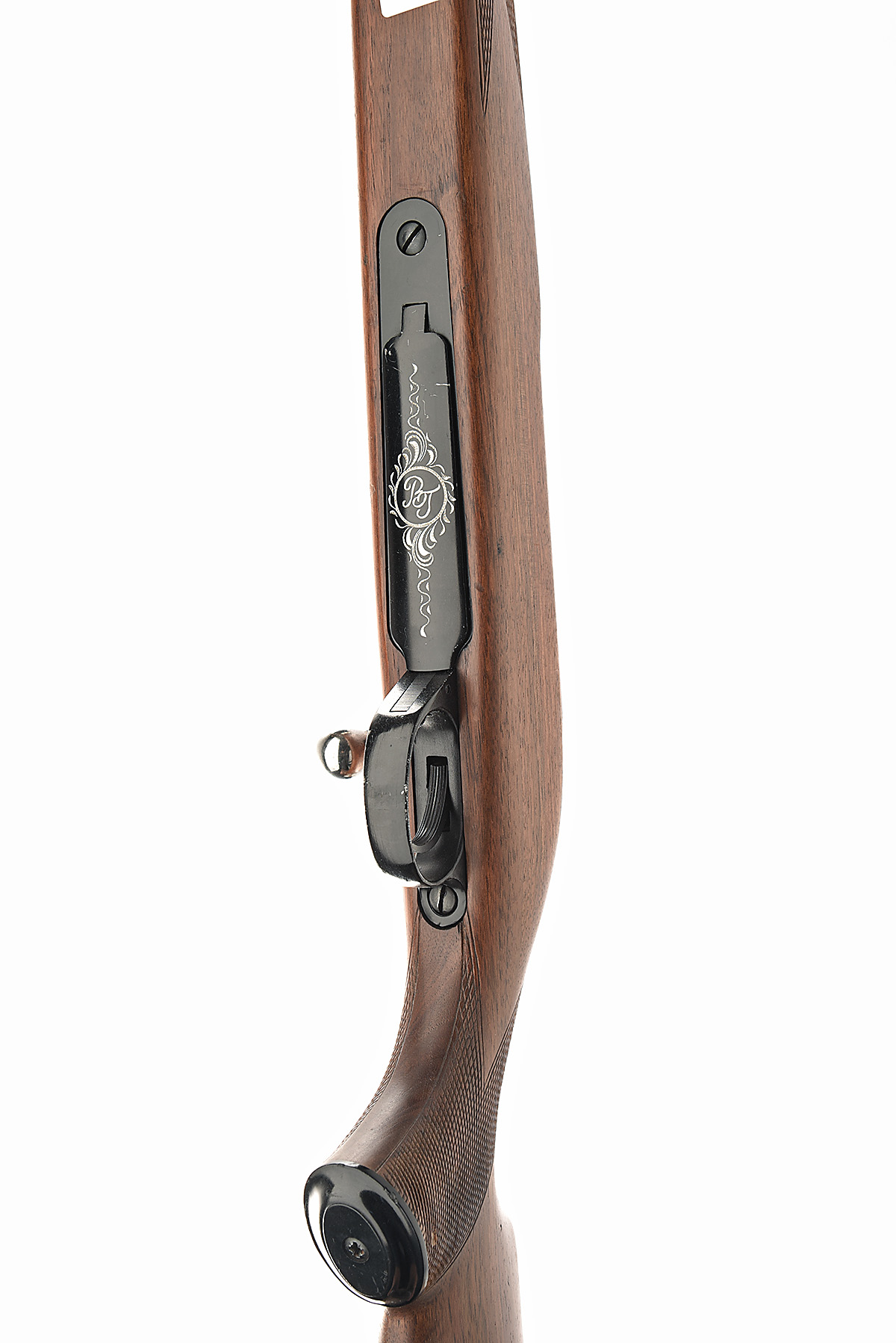 23 3/4in. nitro barrel, ramp-mounted bead fore-sight, folding leaf rear-sight, manual safety, hinged floorplate, figured pistolgrip stock, sling eyes