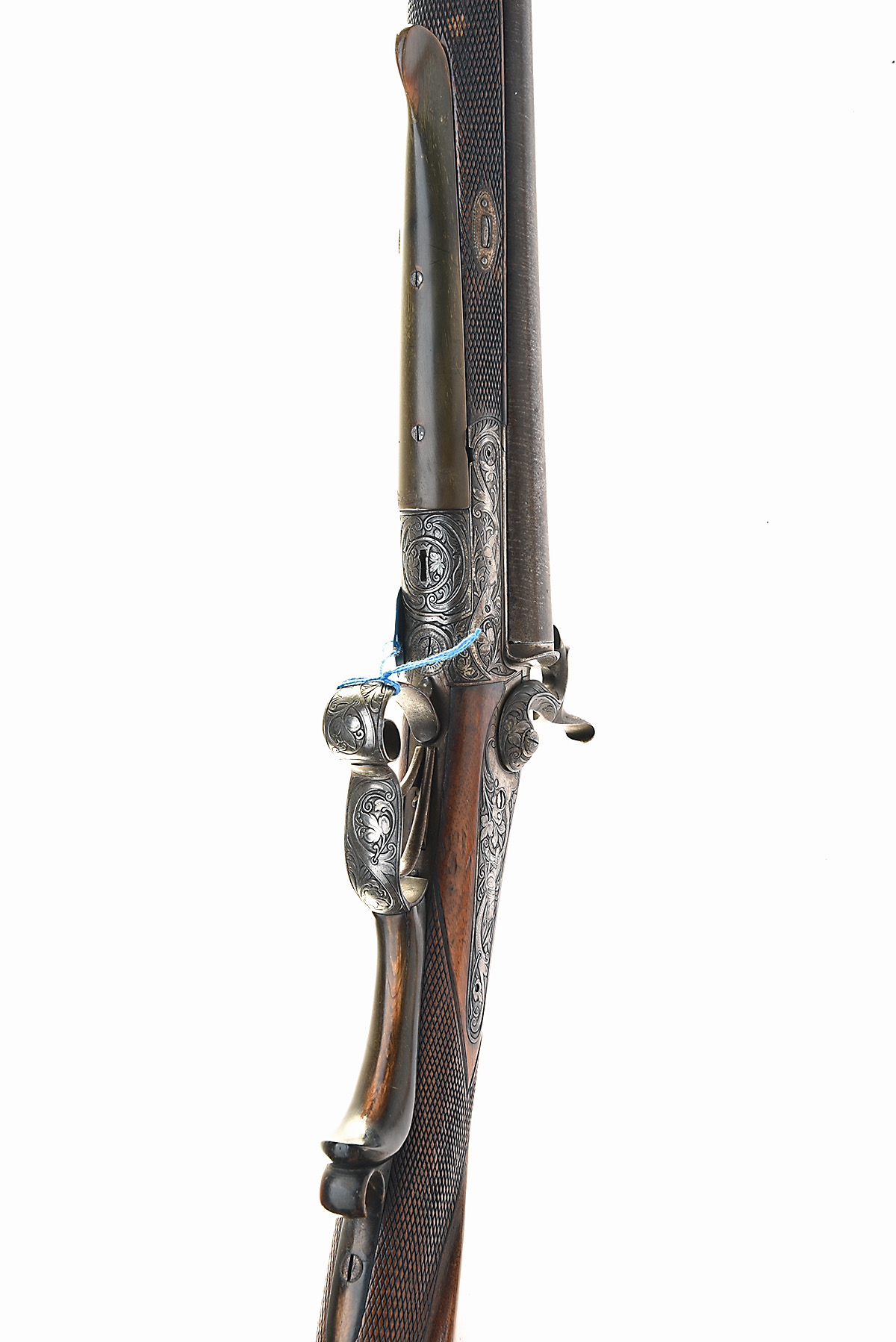 * A 16-BORE PINFIRE CONTINENTAL DOUBLE-BARRELLED SPORTING-GUN, UNSIGNED, serial no. 155, Belgian for the German market circa 1870, with 30in. browned barrels, chisel engraved Lefaucheux style action with forward facing horn-covered under-lever, engraved back-action locks, walnut butt-stock with raised cheek-piece and chequered fore-end